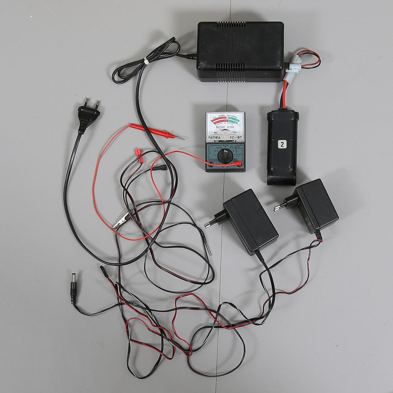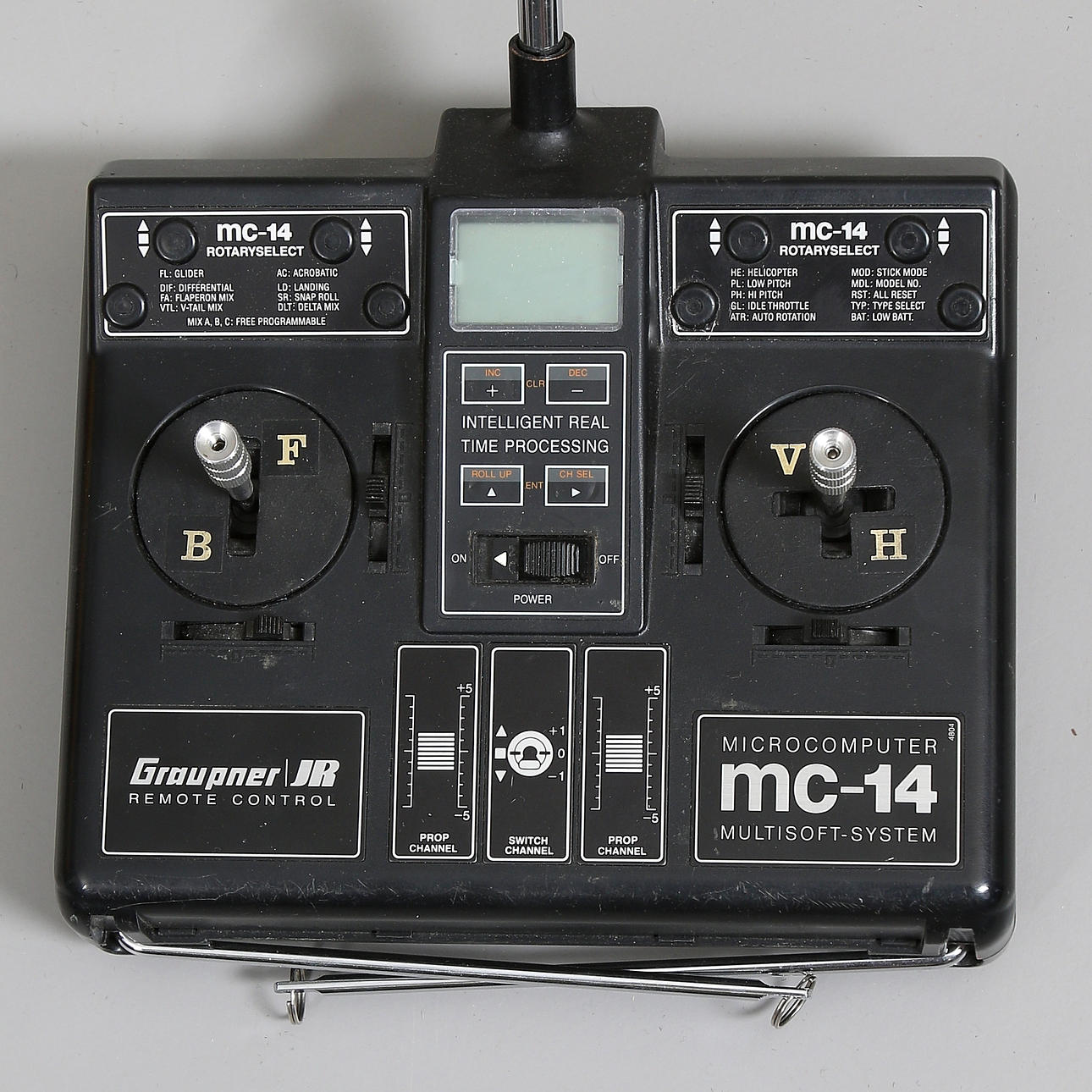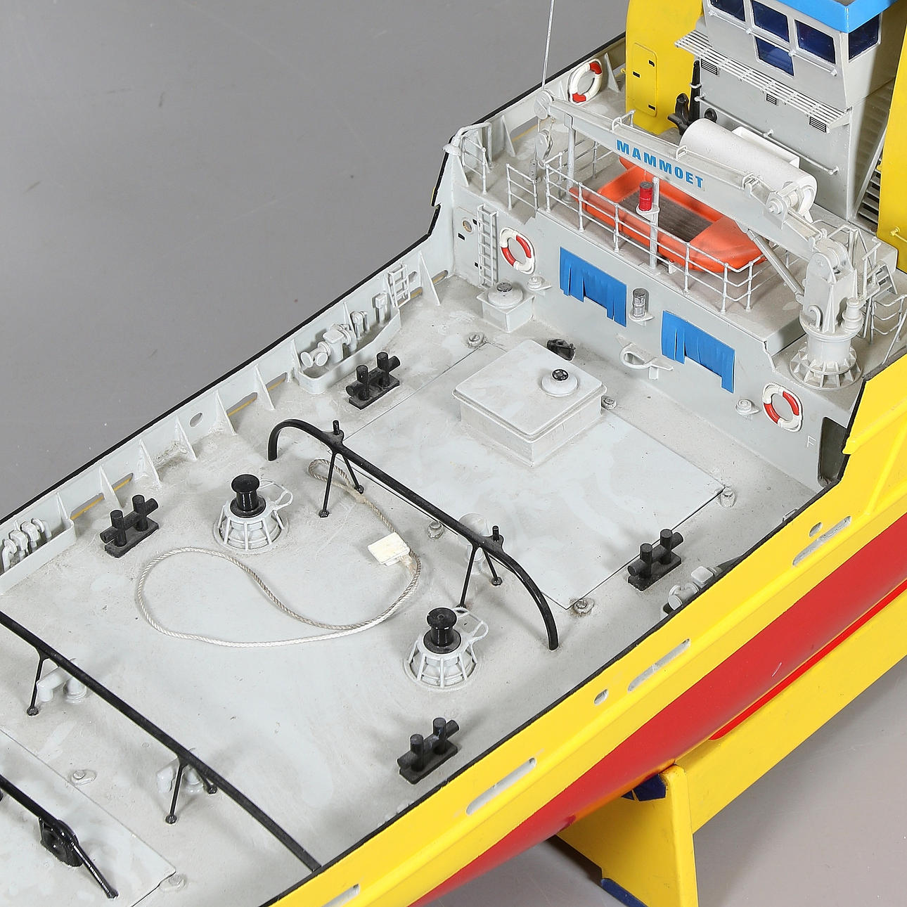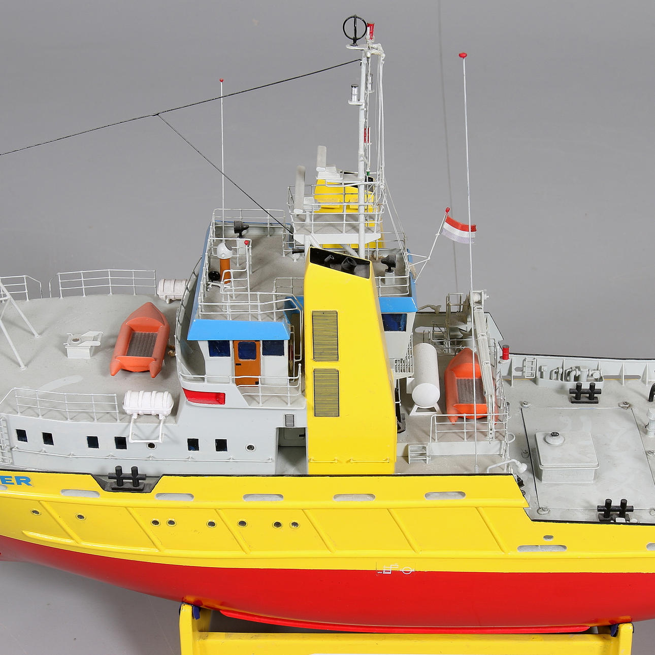 Lackierter GFK-Rumpf, zwei Elektromotoren, funkgesteuert, Länge ca. 102 cm, auf Metallständer, Gesamthöhe ca. 60 cm, inklusive Funksteuerung 14 Kanäle sowie zwei Akkus und Ladegerät.