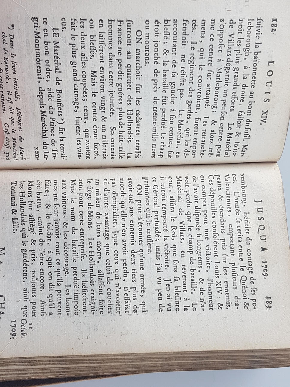 Voltaire - Le Siècle de Louis XIV., Bde I und II in einem Buch,Frankfurt/Main 1753, chez la Veuve Knoch & J.G.Eslinger, 288 und 336S. + Verzeichnis + Brief, Schnitt marmoriert, Vorsatzblätter mit purpurrotem Rankendekor, diese sowie Schmutztitel teils randverschmutzt.
