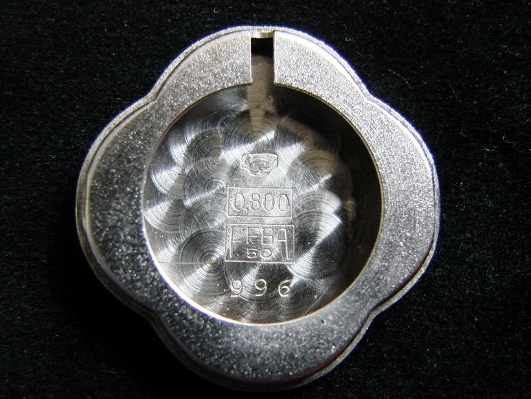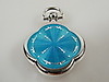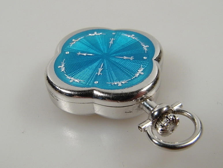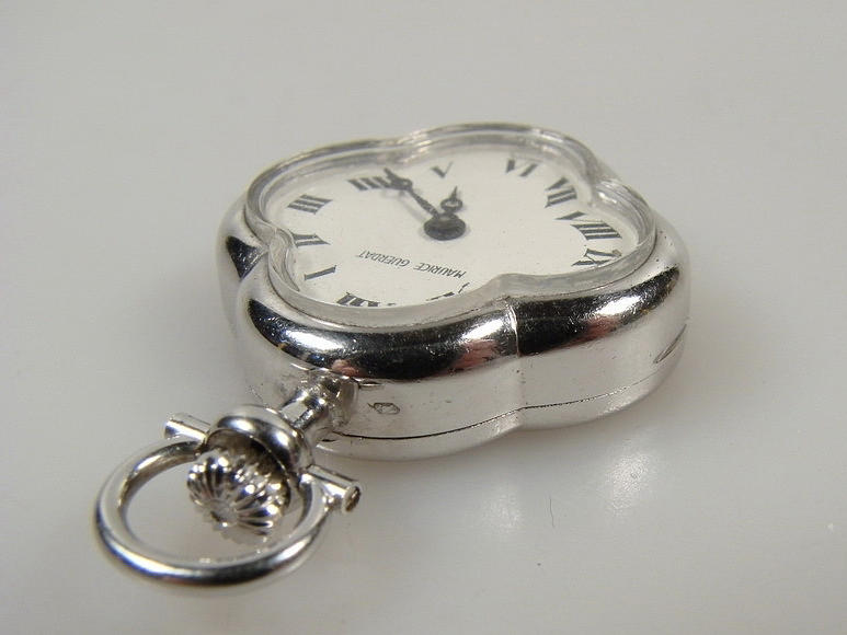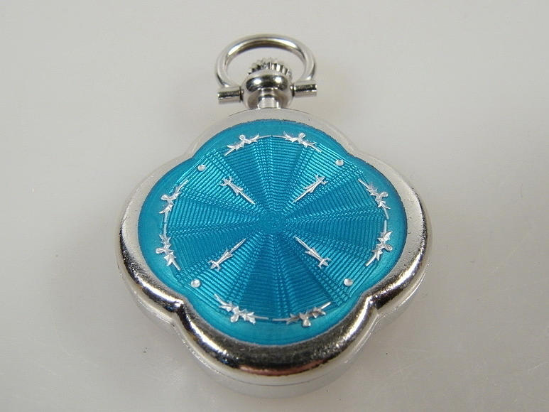 Anhängeruhr „MAURICE GUERDAT“, Nr. 996. 800er Silber. Vierpassiges Gehäuse. Rückseite mit hellblauem Transluzidemail auf guillochiertem Grund. Weißes Email-Zifferblatt mit römischen Zahlen, durchbrochen gearbeiteten Zeigern. Werk mit Kronenaufzug und 17 Steinen, läuft. Länge mit Öse: 36,1 mm. Breite: 24,7 mm. Dicke: 7,8 mm. Gewicht: 11,4 g. Gepunzt: Schweizer Beschauzeichen / 0,800 / FFBA 50.