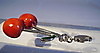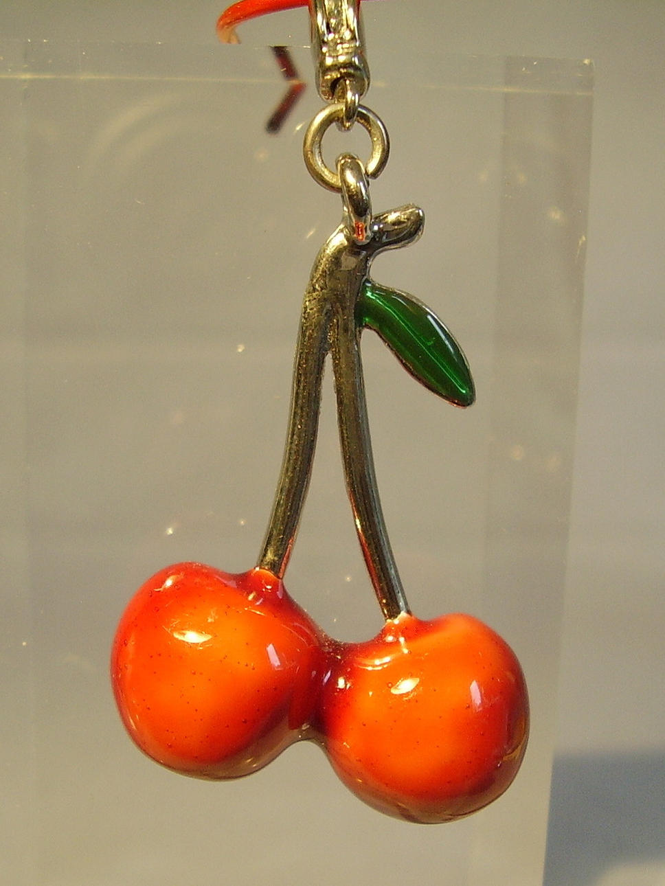 Der Modeschmuck Anhänger ist in rhodinierter Schmucklegierung gearbeitet in Form eines Zweiges mit einem Paar Kirschen mit Blättern ausgeführt. Es ist farbig lackiert und mit einer Karabiner-Öse ausgestattet. Dadurch kann es als Charm an einem Armband oder Kette getragen werden.
