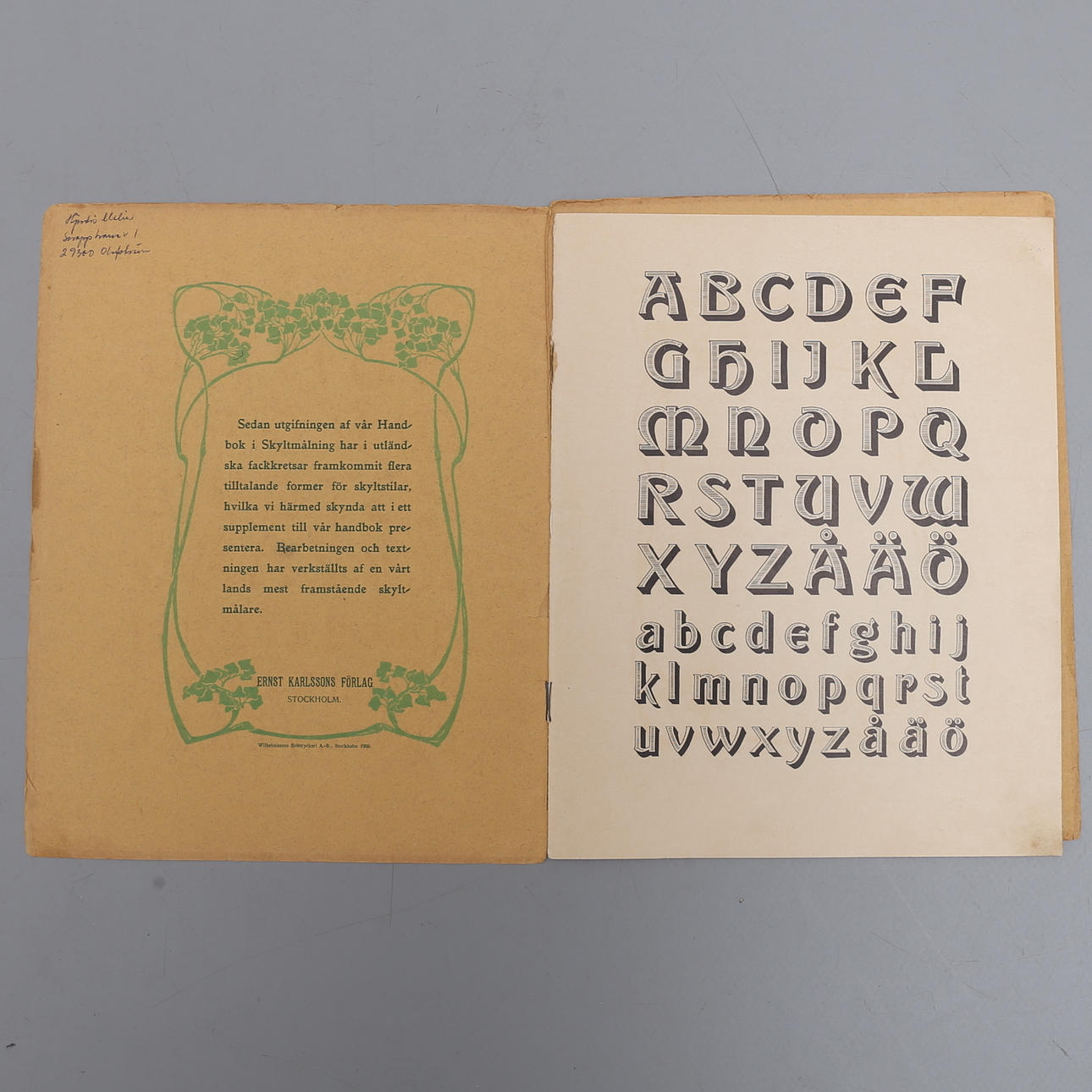 Sandholm, Thure, Schildermaler. Handbuch der Schildermalerei. Praktische und knappe Regeln und Ratschläge zum Zeichnen und Malen, insbesondere von Geschäftsschildern, sowie eine Beschreibung der Ausführung von Glasschildern, Graffiti-Malerei, Statuten und Bannern usw. Ernst Karlssons Verleger, Stockholm, 1904. Geheftetes Folio. Illustriert in Farbe und Schwarzweiß mit Stil- und Motivbeispielen. 87 S. , (III). + Ergänzung zum Handbuch Schildermalerei. Gehefteter Folio mit bedrucktem Einband. 16 p.