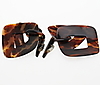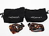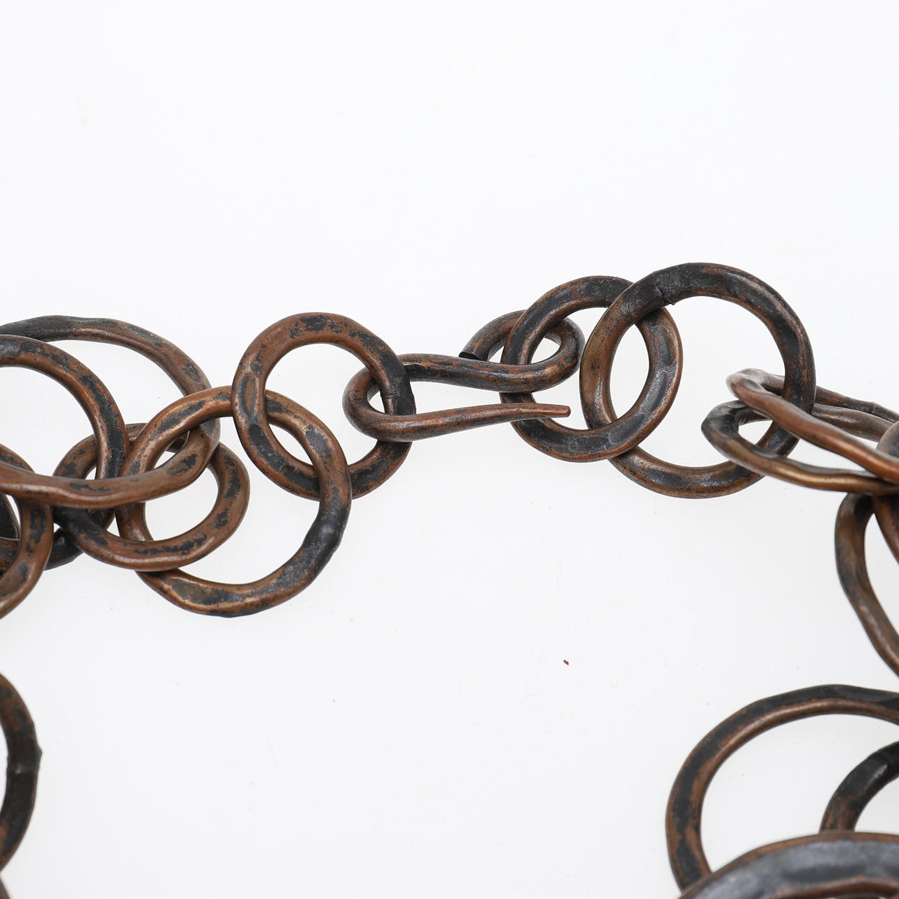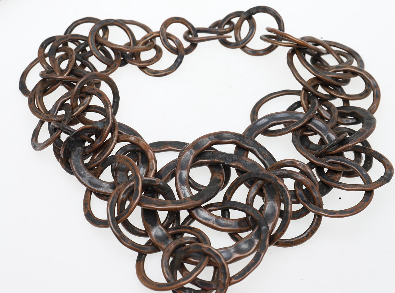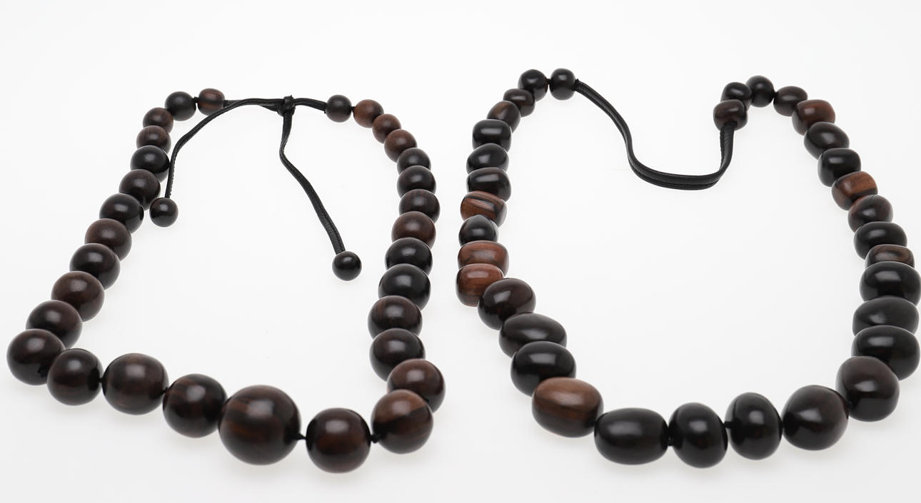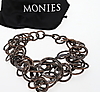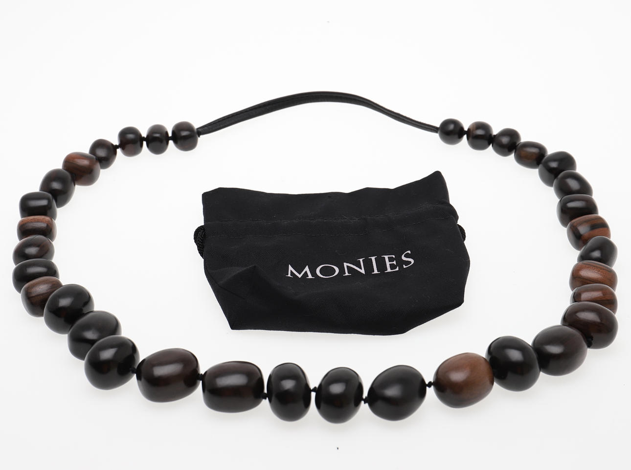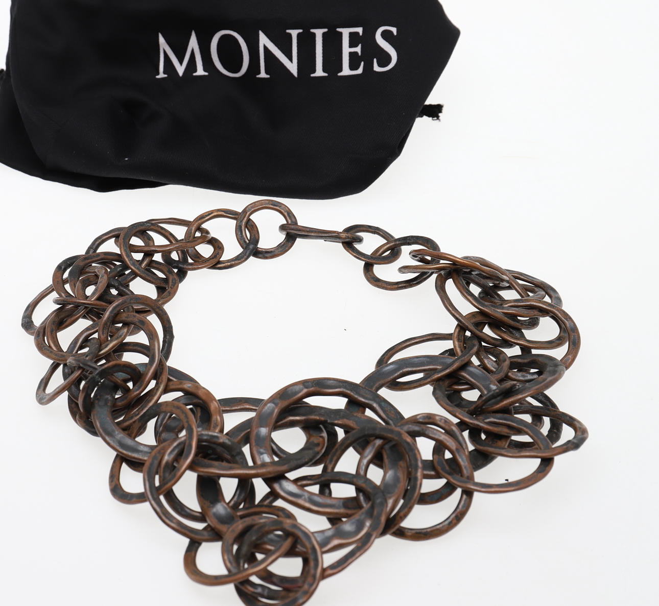 Bestehend aus einem Mode-Kleiderring mit vergoldeter Platte, signiert Monies, Fingergröße P 1/2, in originaler Monies-Tasche; ein Paar geometrische Ohranhänger aus gebeiztem Kuhhorn, mit Clip-Beschlägen, signiert Monies, 15,9 cm lang, in Monies-Beutel; und eine abgestufte Kette aus runden Kupfergliedern mit geschwärzter gehämmerter Oberfläche in einem Monies-Beutel; und zwei abgestufte Holzperlenketten, beide mit einem Geldbeutel.
