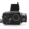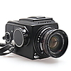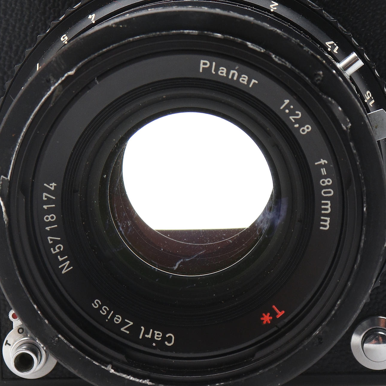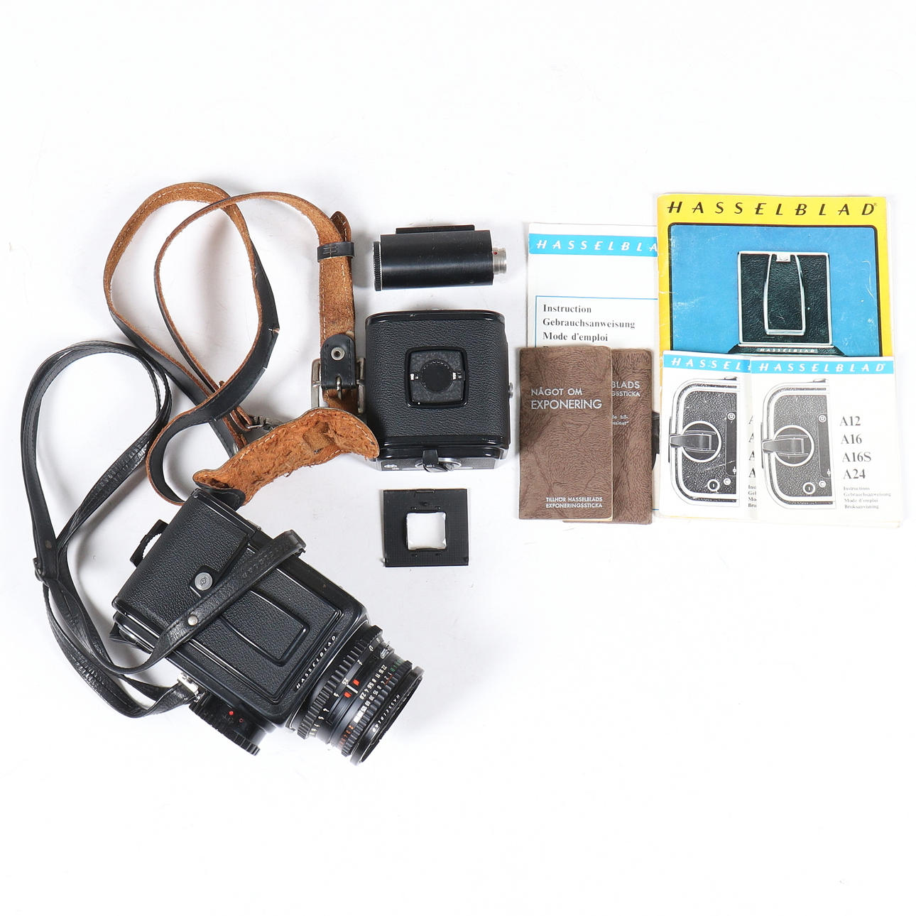 1 Objektiv Zeiss T* Planar 2,8/80 mm. 1 Hasselblad-Katalog mit Details und Beschreibungen mit Bildern der verschiedenen Zubehörteile und Kameragehäuse von Hasselblad.
