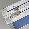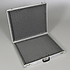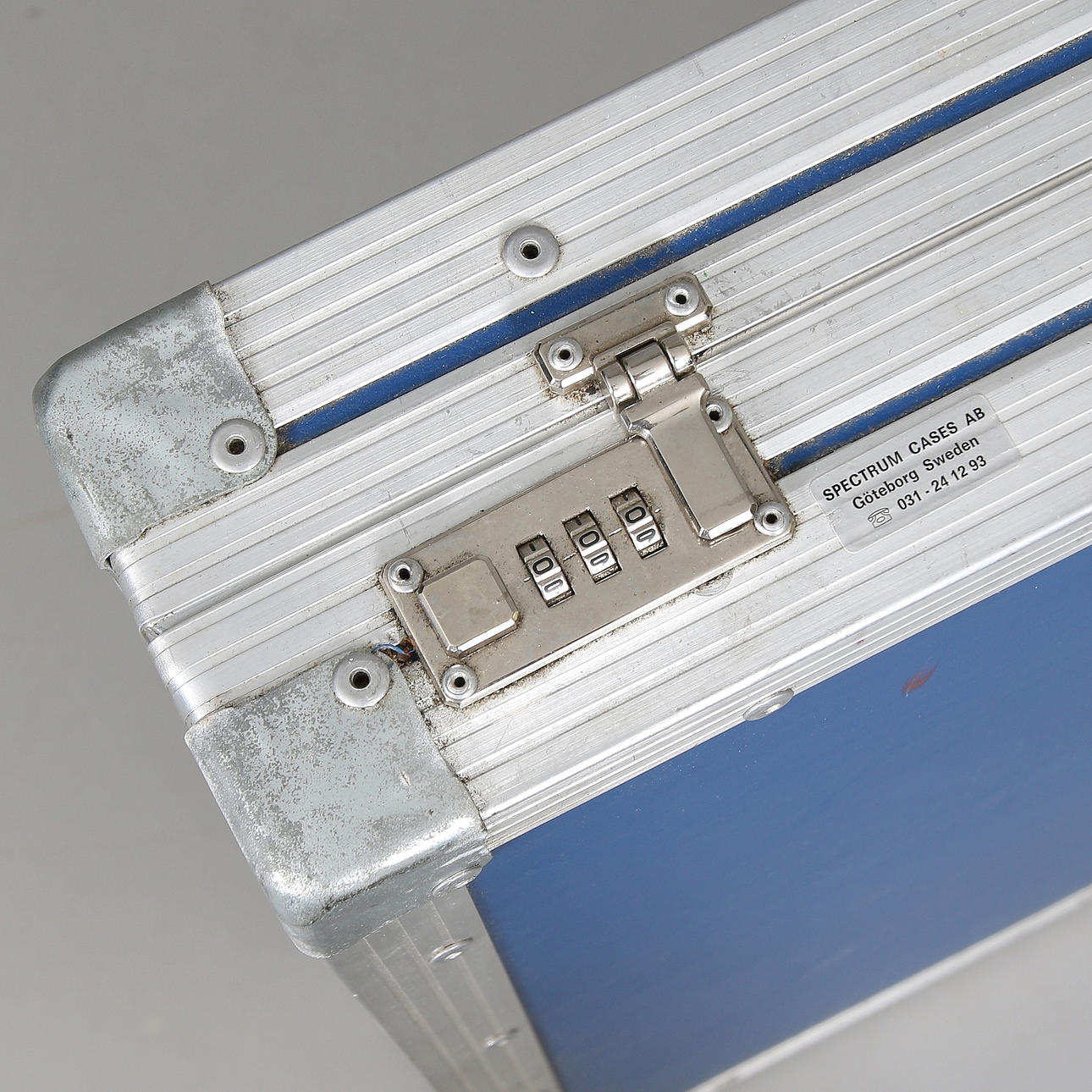 Kunststofffurniertes Sperrholz mit Aluminiumbeschlägen. Kombinationsschloss. Innenfutter aus Moosgummi. Innenmaß, Länge 58, Höhe 72, Höhe 4 cm. Außenmaß Länge 65, Breite 79, Höhe 11 cm.
