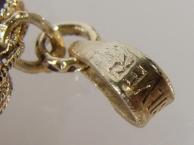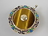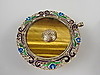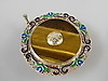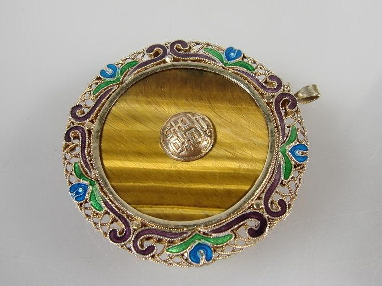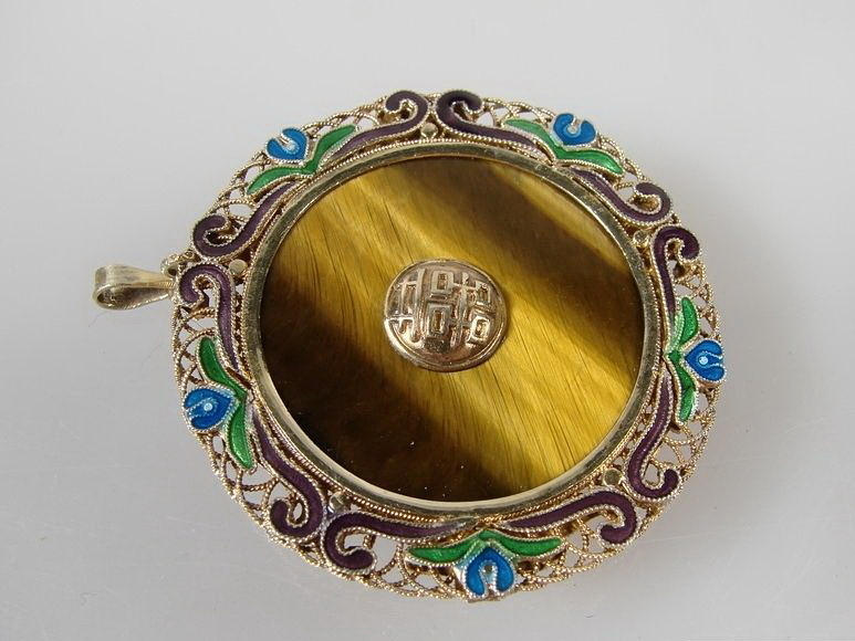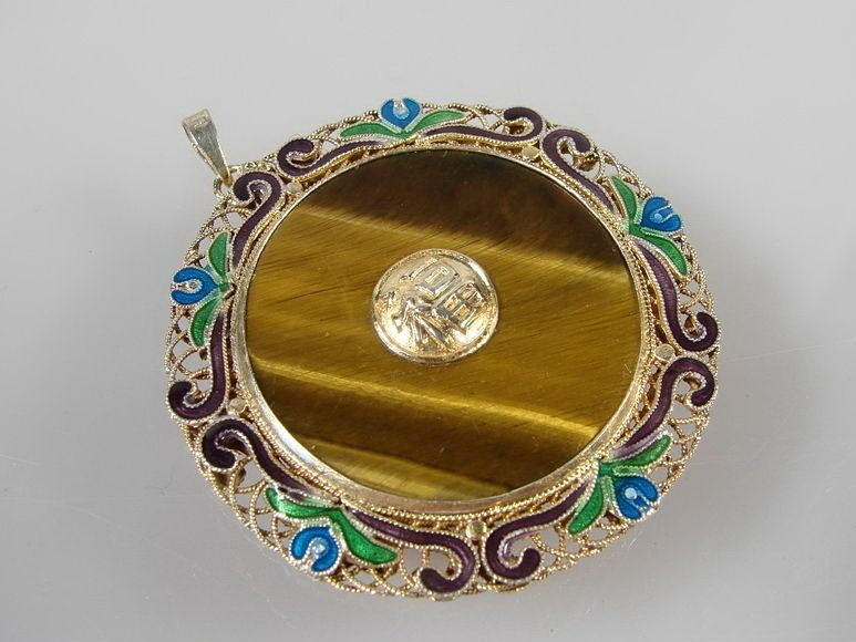 Glücksbringer-Anhänger mit Tigerauge und Email. Silber vergoldet. China. Aufwendig gestalteter, runder Anhänger mit bunten Tranzluzidemail-Blüten am Rand. In der Mitte zargengefasste Steinplatte mit beidseitigem, aufmontiertem Relief eines Schriftzechens / Glückssymbol / Hieroglyphen. Durchmesser: 42 mm. Gewicht: 11,6 g. Gepunzt: Silver.
