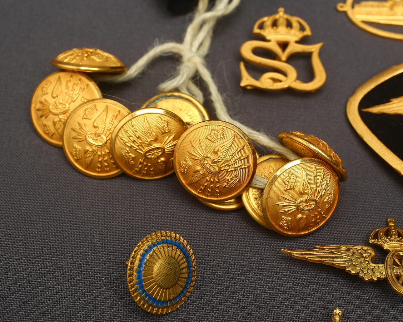 Unter anderem 2 Schnallen mit Nadel (Höhe ca. 6 cm) und 10 Knöpfe.