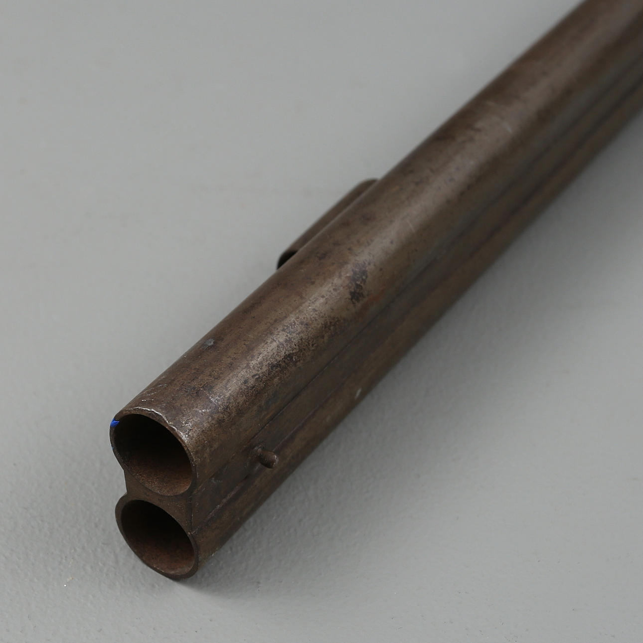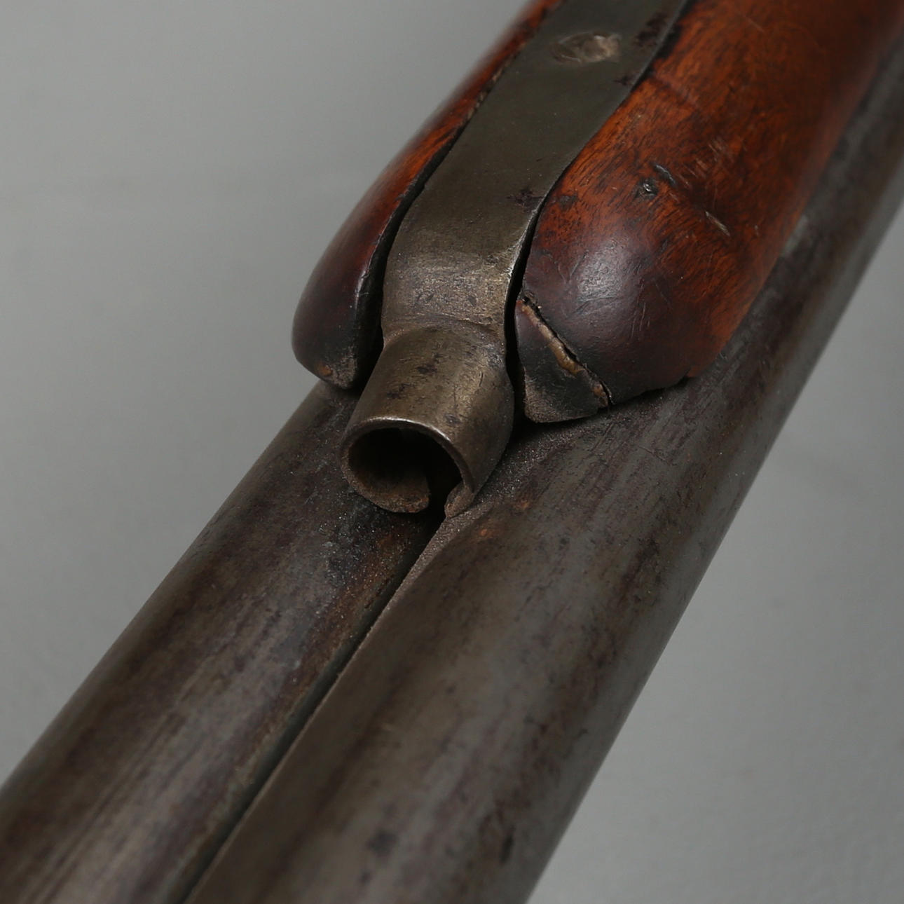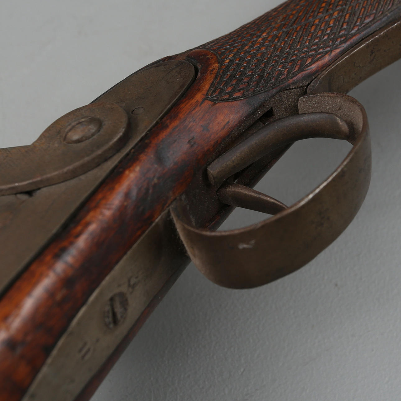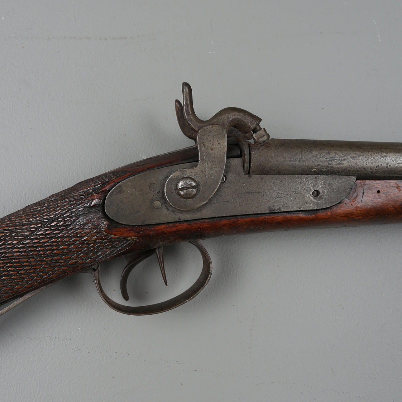 Doppelläufiges Perkussionsgewehr mit Eisenbeschlägen und Birkenschaft.