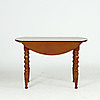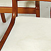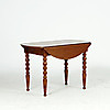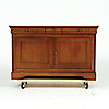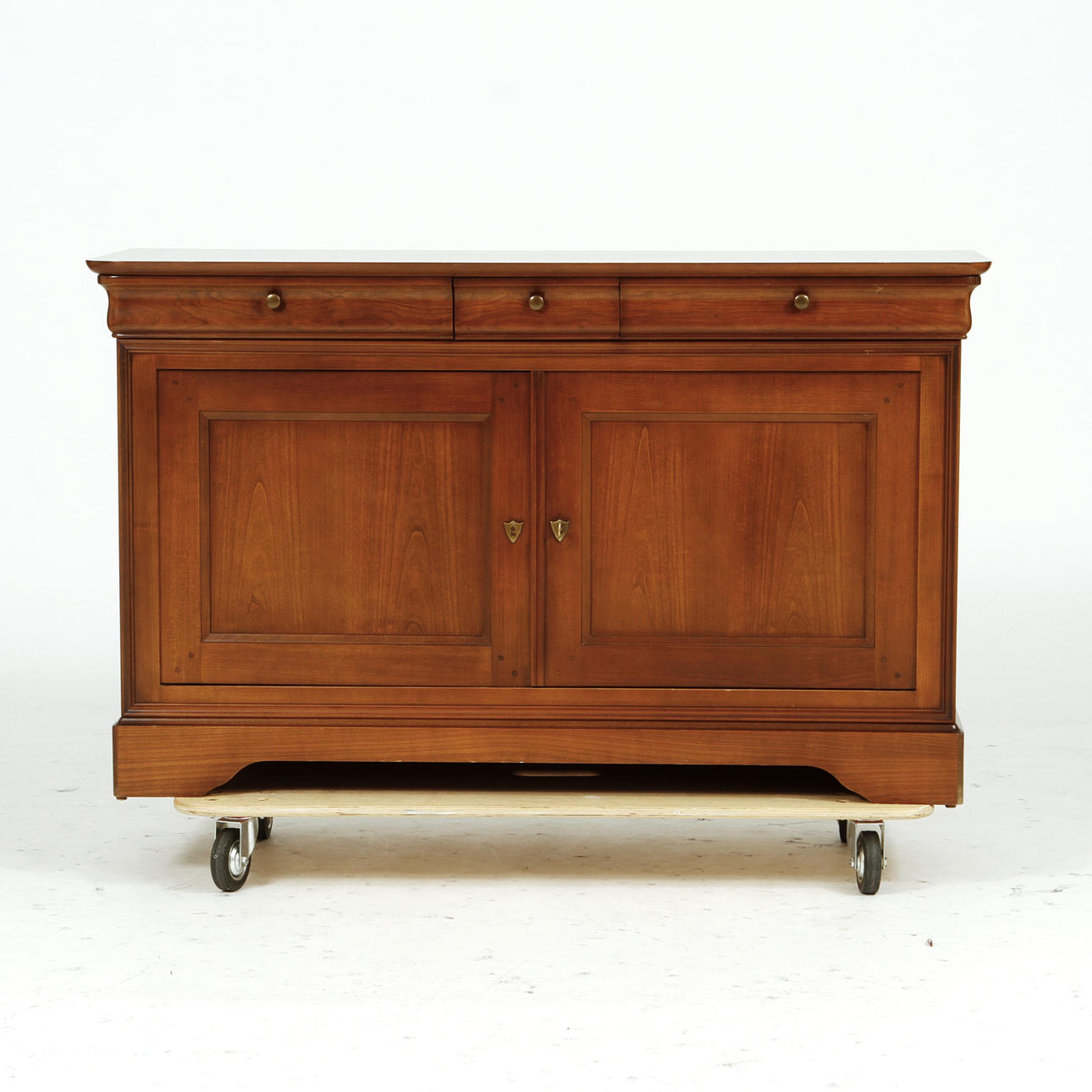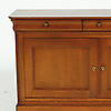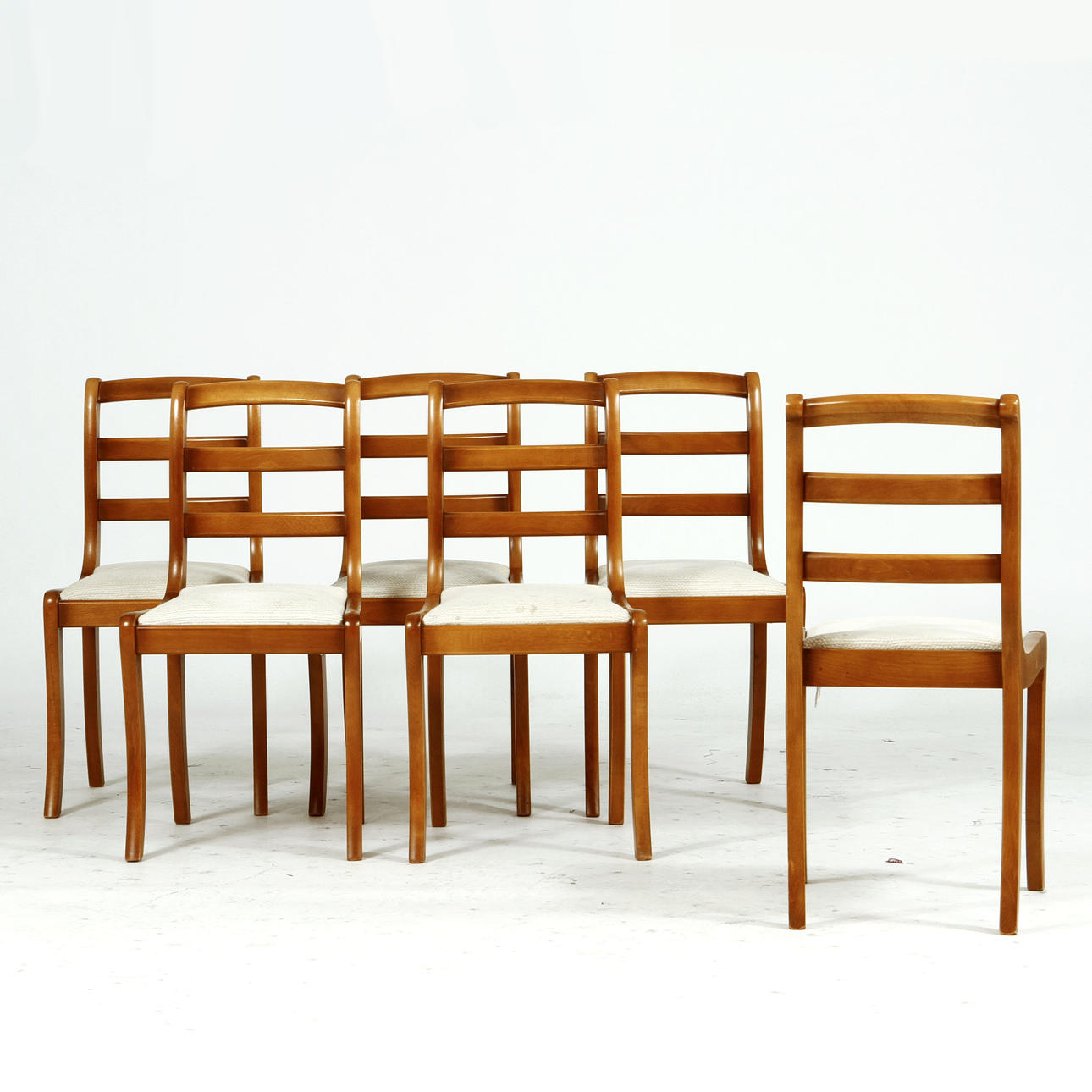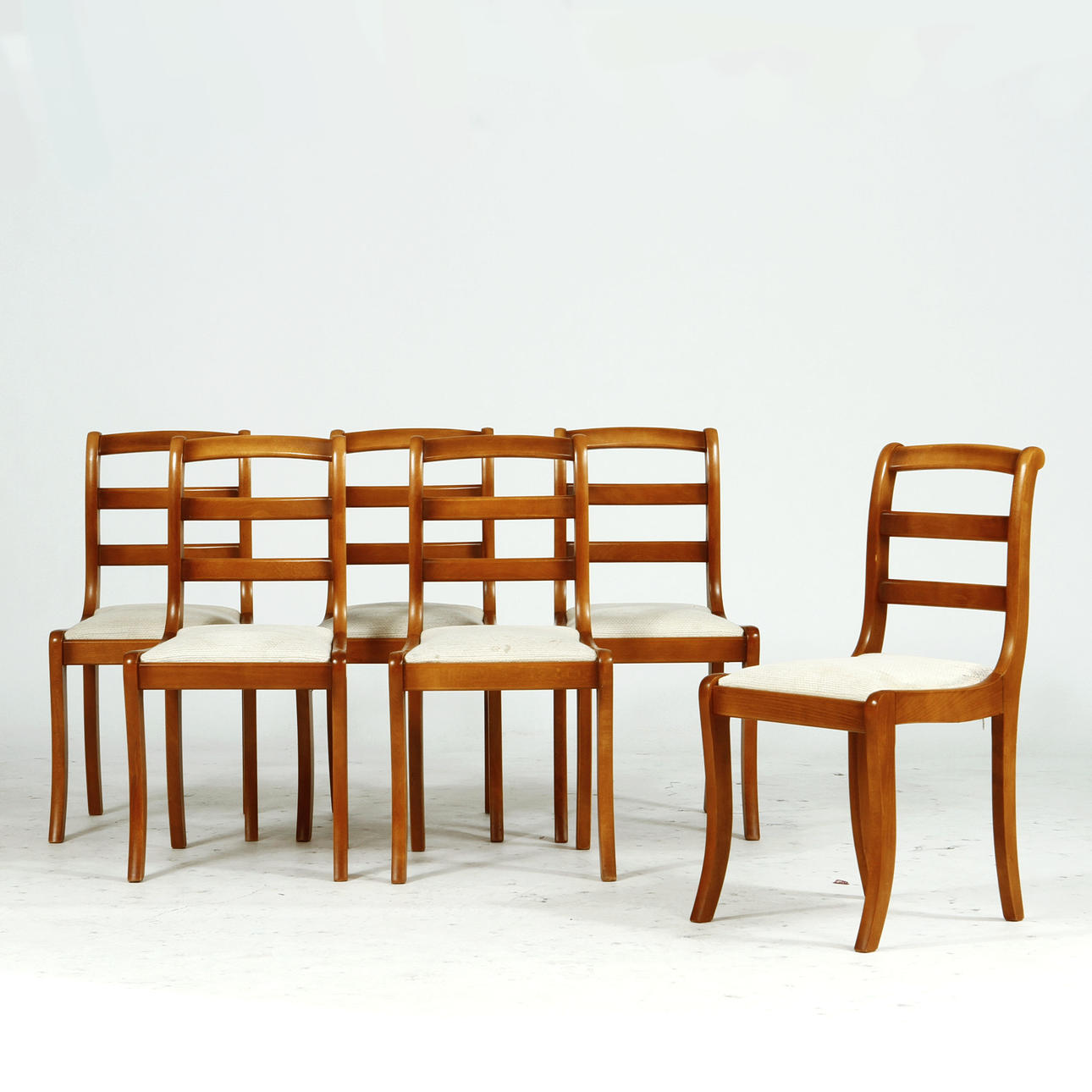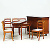 Tisch, sechs Stühle und Sideboard. Walnuss- und Kirschholz. Sideboard: Länge 141 cm, Höhe 84 cm, Tiefe 51 cm. Tisch: Länge 115 cm, Breite 60, mit zwei Klappen von 20 cm und zwei Einlegeplatten von 30 cm. Stühle mit gepolsterter Sitzfläche.