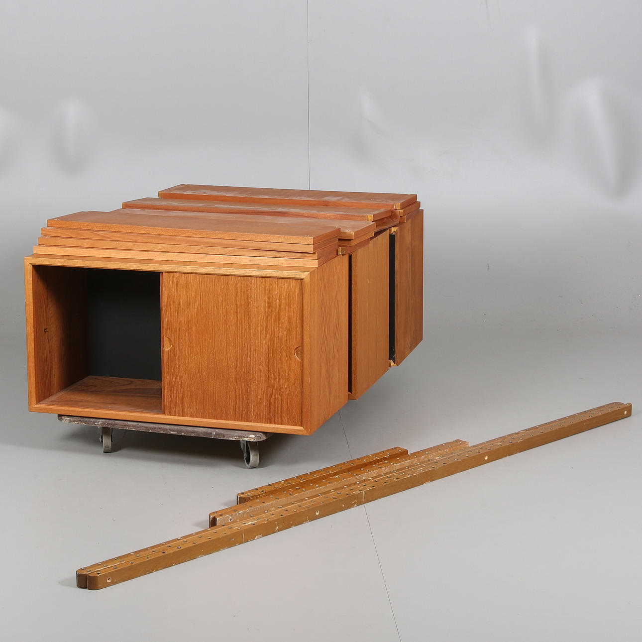 Teak furniert und Nussbaum, 12 Einlegeböden, 2 Zeitschriftenhalter, 4 Schränke mit Schiebetüren. Länge 325, Breite 37,5, Höhe ca. 191-200 cm (siehe Bild).