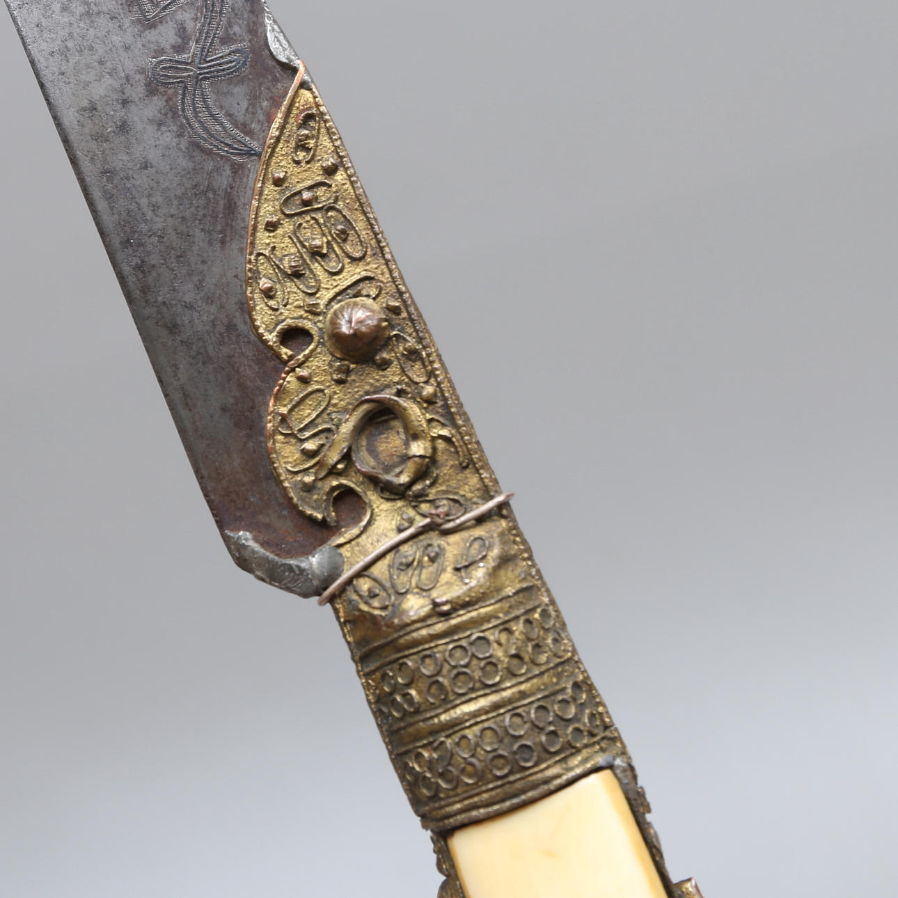 Knochenbearbeiteter Griff, teilweise mit eingebetteten Steinen.
