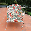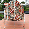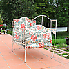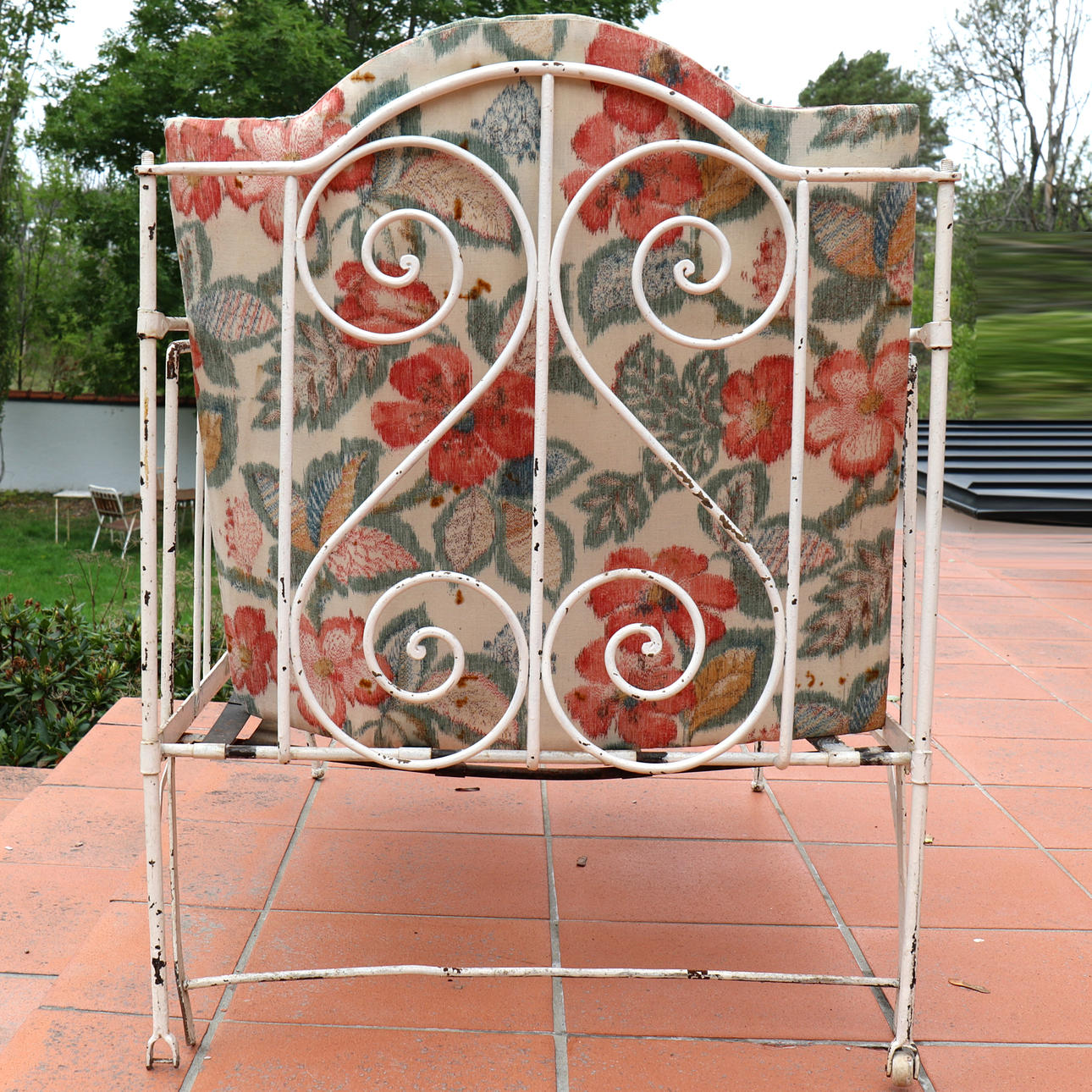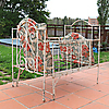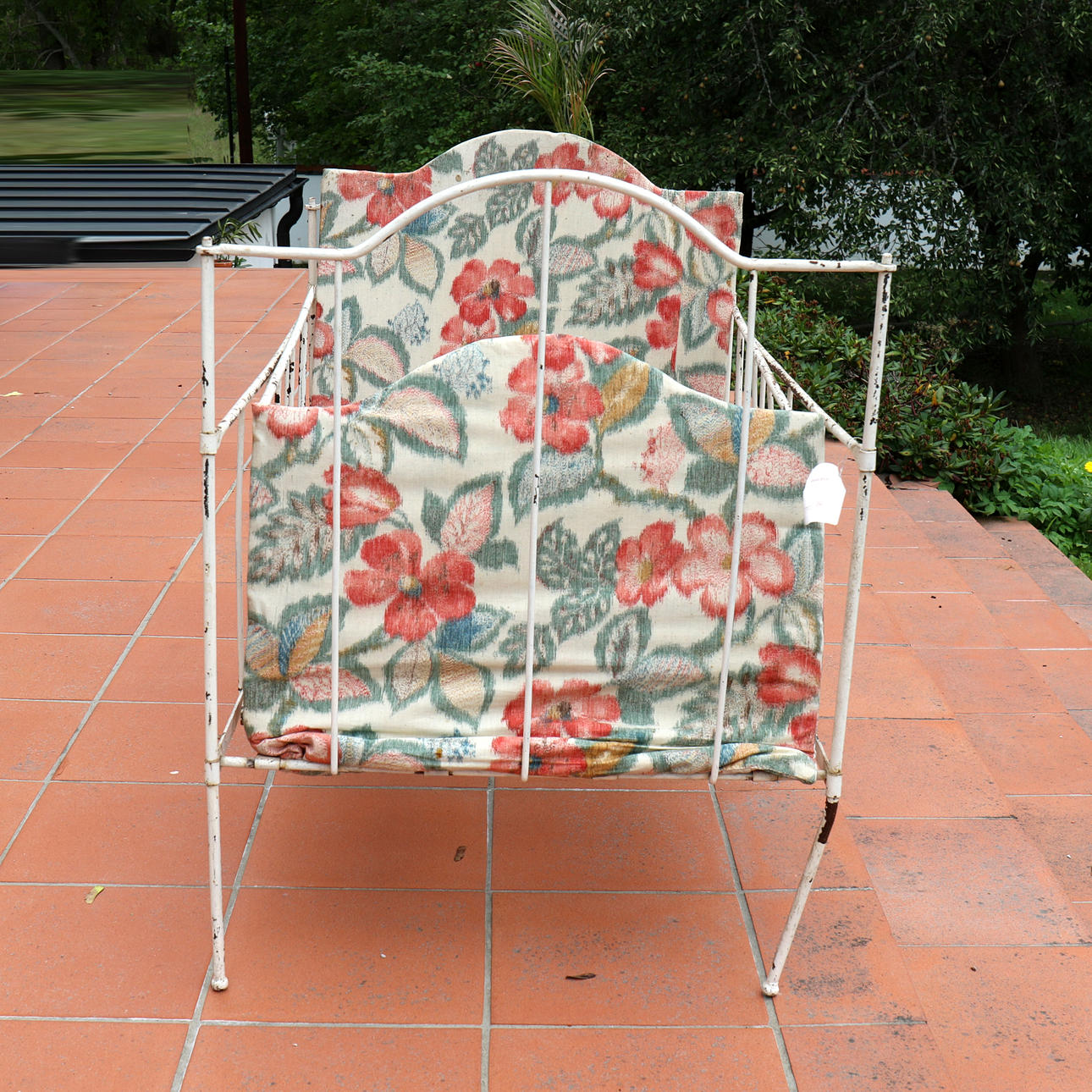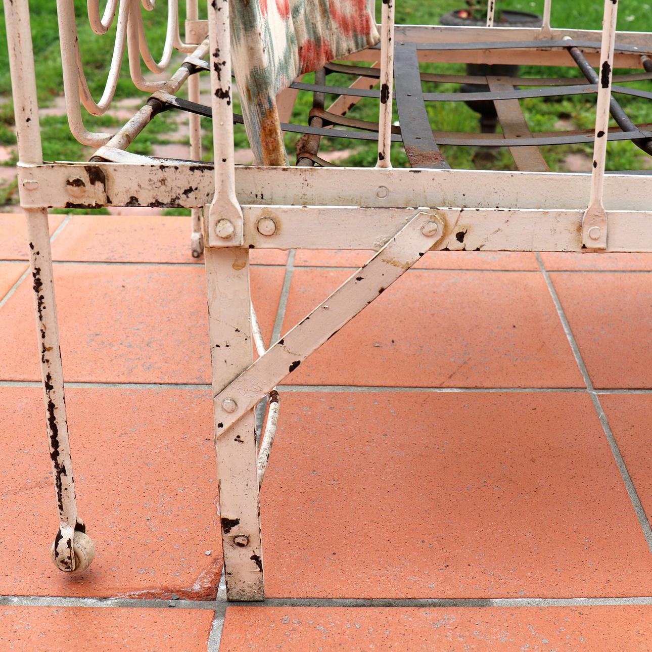 Schiefe Beine, wulstige Bettbasis und abblätternde weiße Farbe, etwas Rost.
