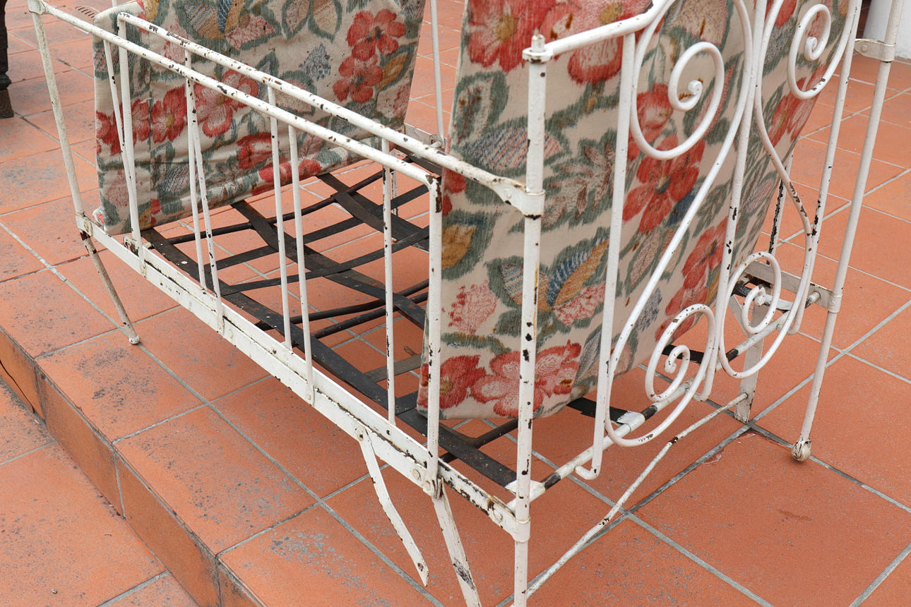 Klassisches Kinderbett in weiß lackierter Metallkonstruktion, Anfang des letzten Jahrhunderts. Lattenrost aus Metall.