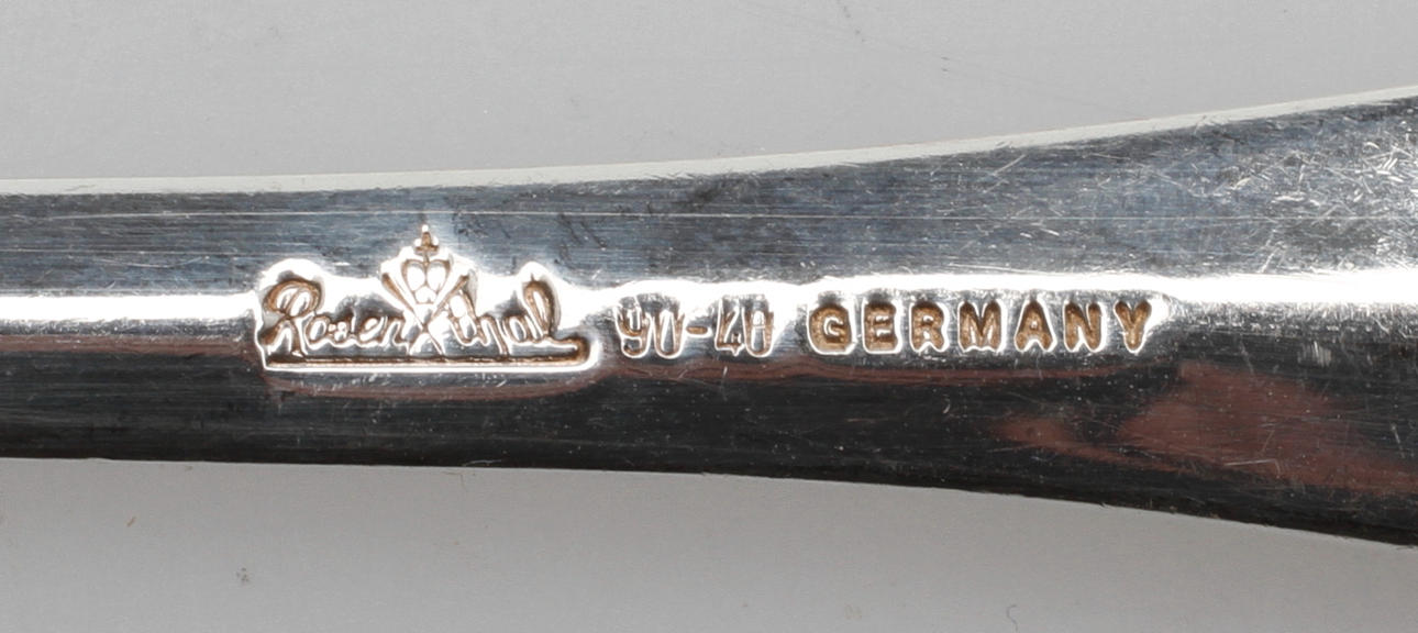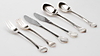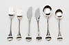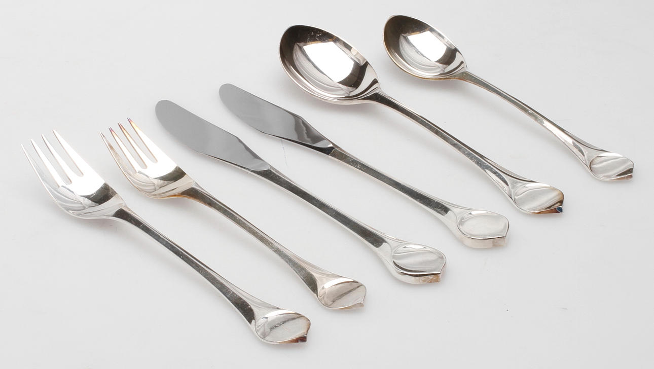 10 Speisegabeln, Länge 19 cm, 10 Speisemesser, 10 Esslöffel, 10 Vorspeisengabeln, Länge 17 cm, 10 Vorspeisenmesser, 10 Vorspeisenlöffel.