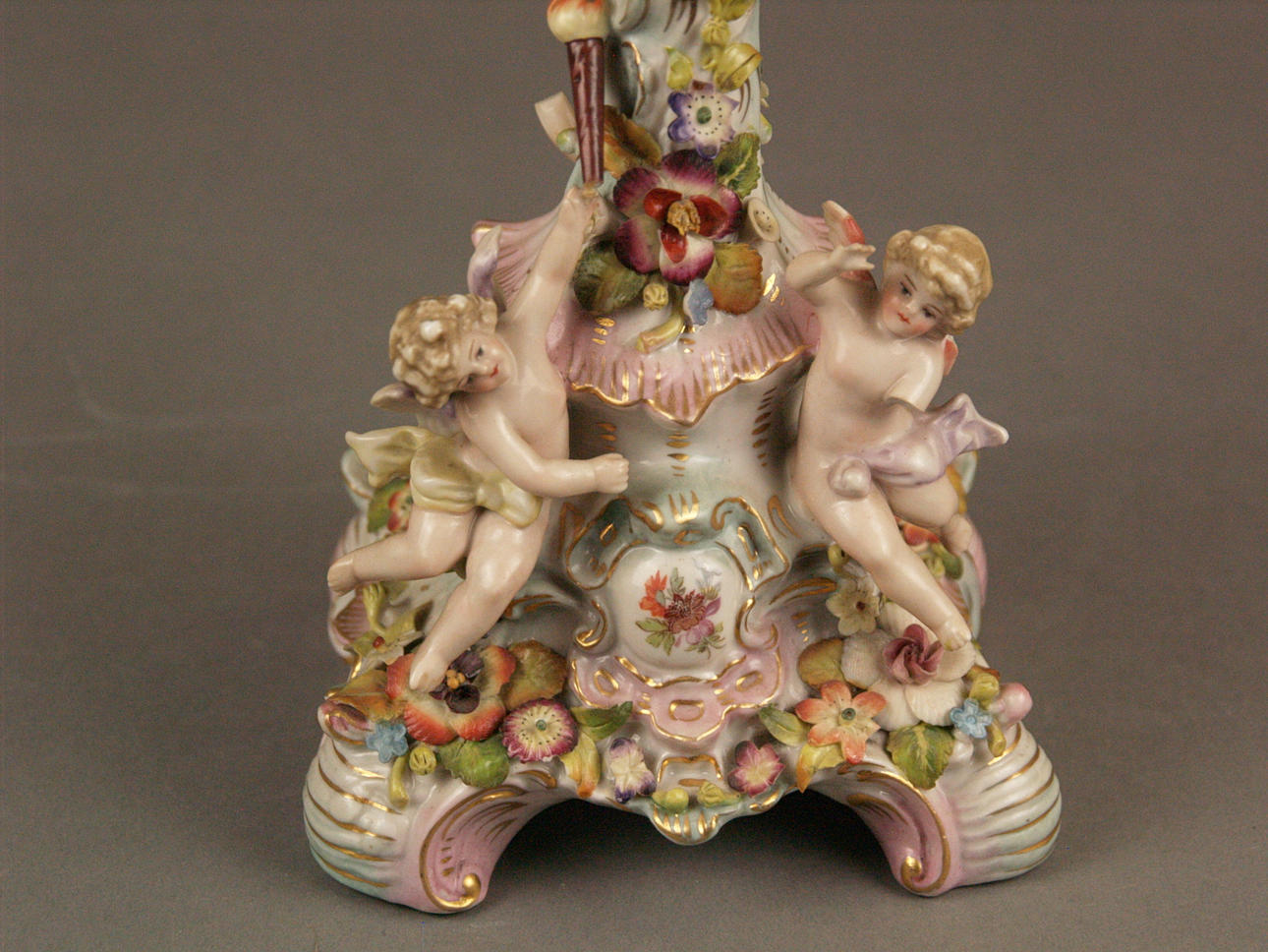 applizierte Blütten teilweise bestoßen, Schaft mittig geklebt, Putten stellenweise bestoßen (Arme, Flügel, Fackel, Finger, Zehen), bei einem Putto Kopf restauriert (geklebt), Staffage leicht berieben.