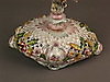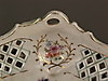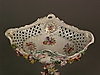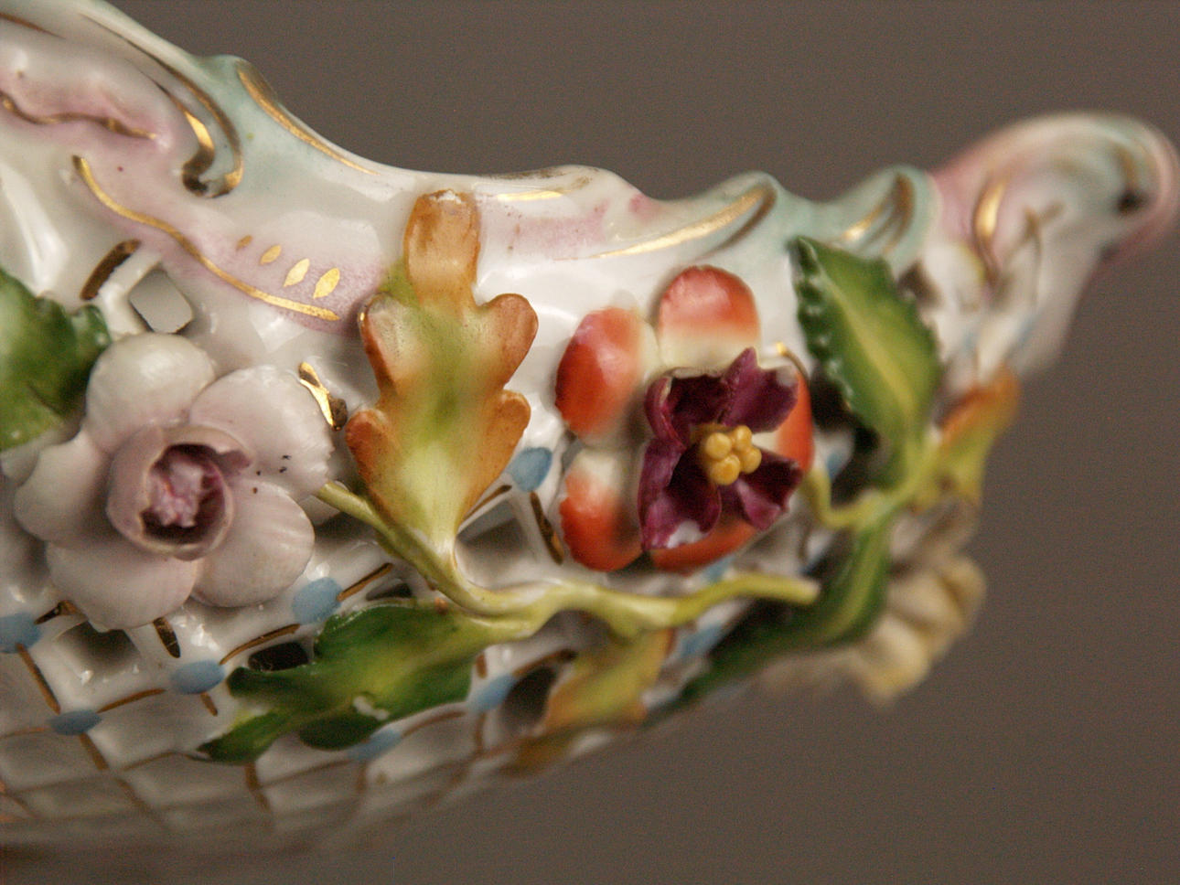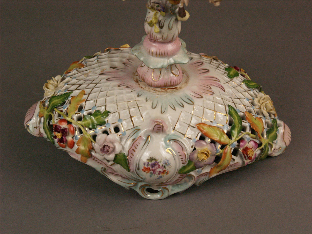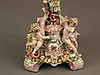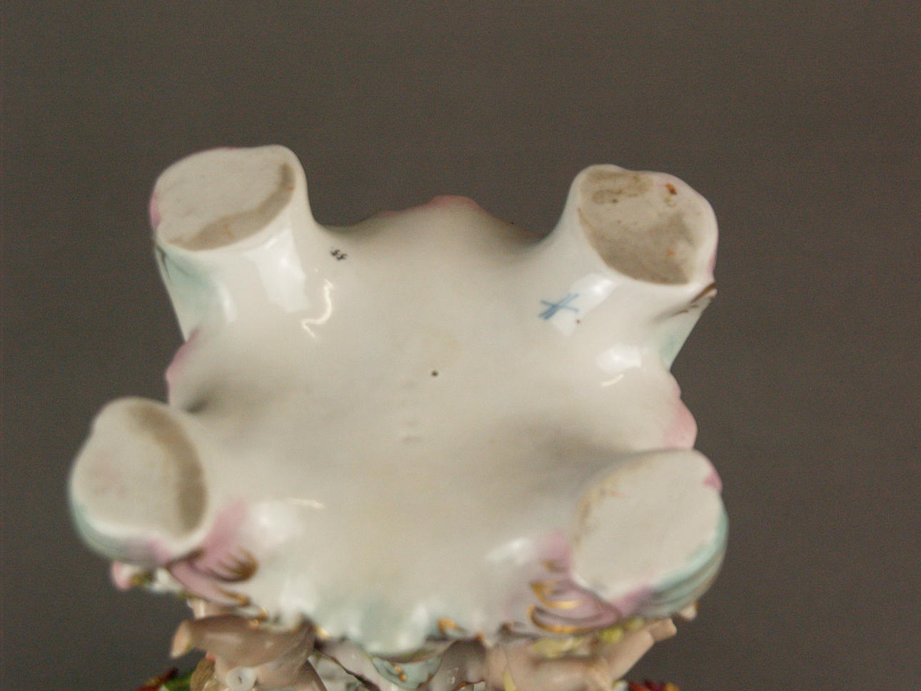 Figürlicher Tafelaufsatz - Sitzendorf, Thüringen, blaue Marke mit gekreuzten Linien, partiell durchbrochene geschweifte Schale auf einem Rocailleschaft mit drei vollplastischen Putten, Stand mit vier Rocaillefüßen, polychrom bemalt und gold staffiert, Reserven mit Blumenbouquets, Spiegel mit Blumendekor, H.ca.28cm.