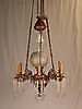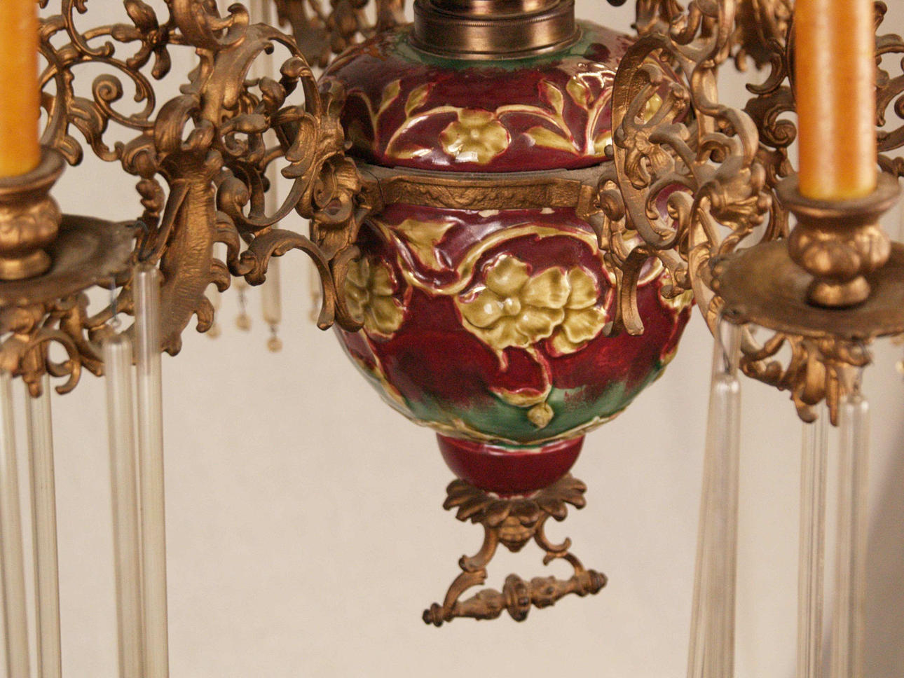 glasierter Keramik, halbplastisches Blumenmuster in Rot, Gelb und Grün, 6 reich ornamentierte geschwungene Arme mit Kerzentüllen, vergoldet, runder Glasschirm mit geschliffenem Sternendekor, Glasstäben-Behang, Kettenaufhängung mit Gegengewicht.
