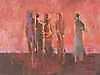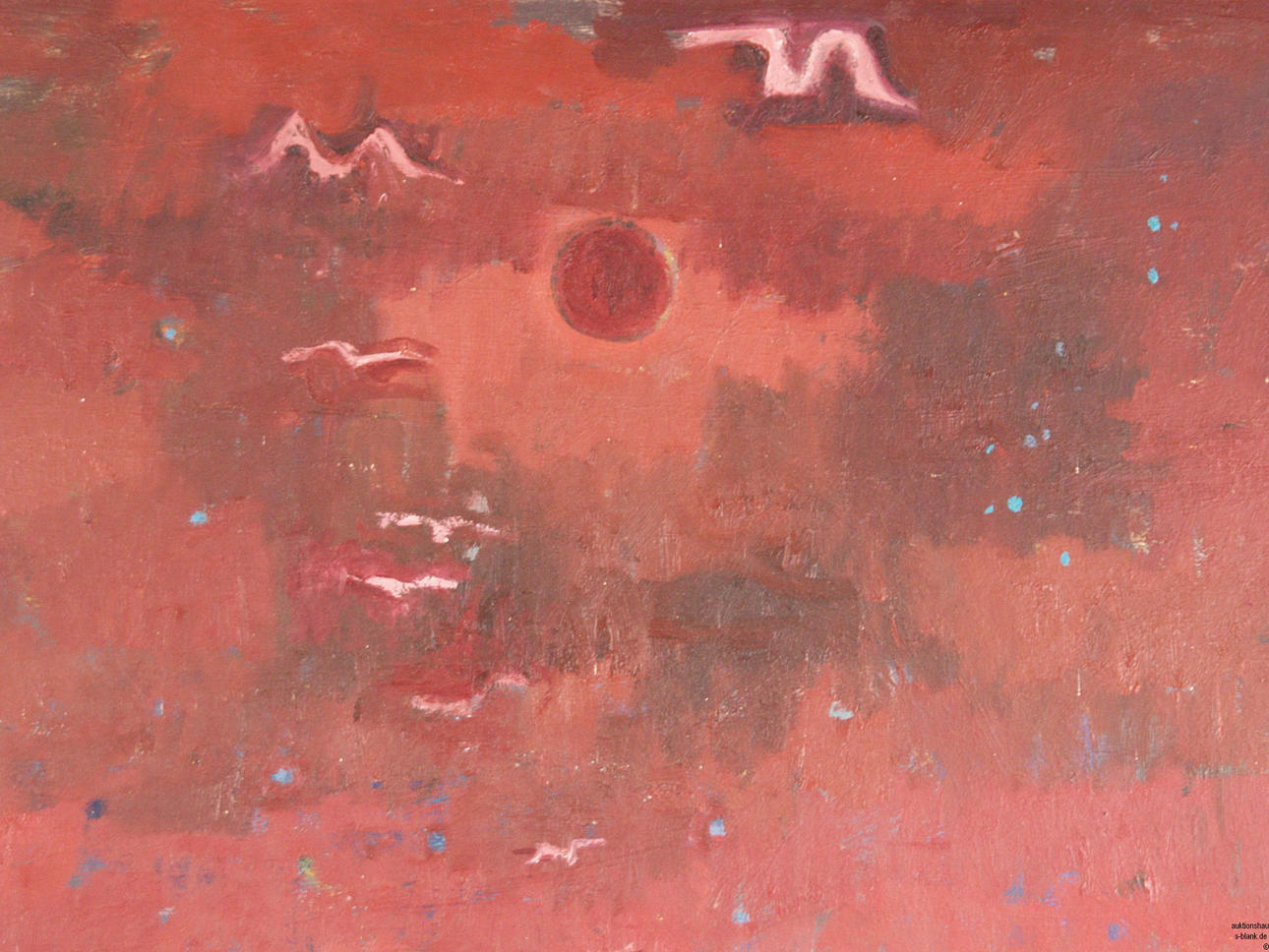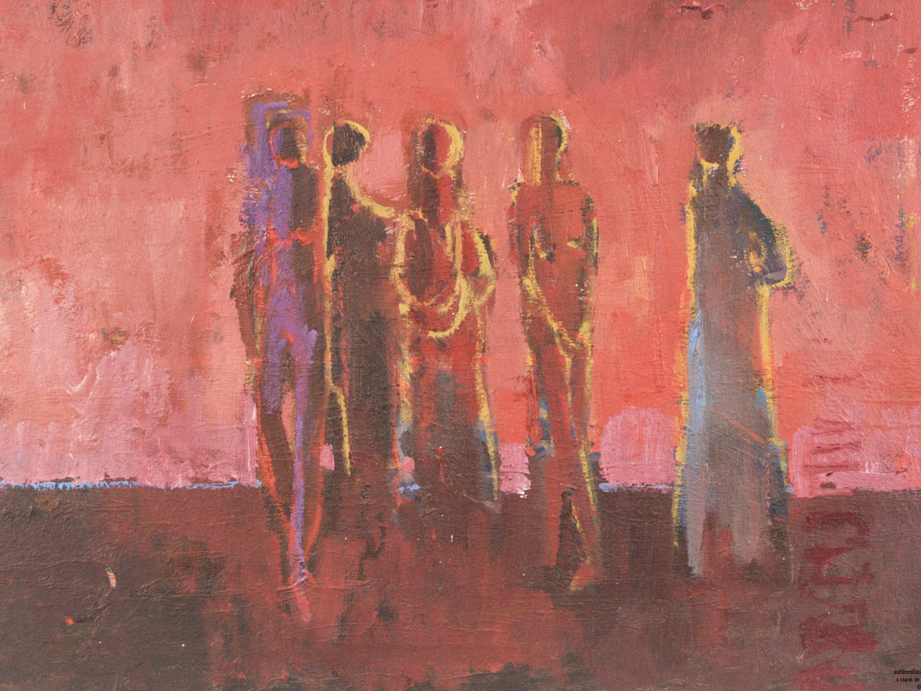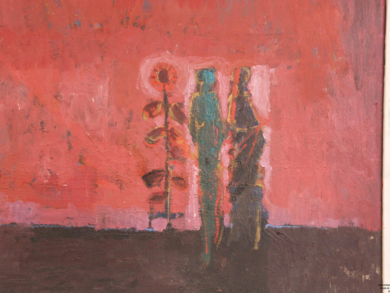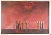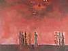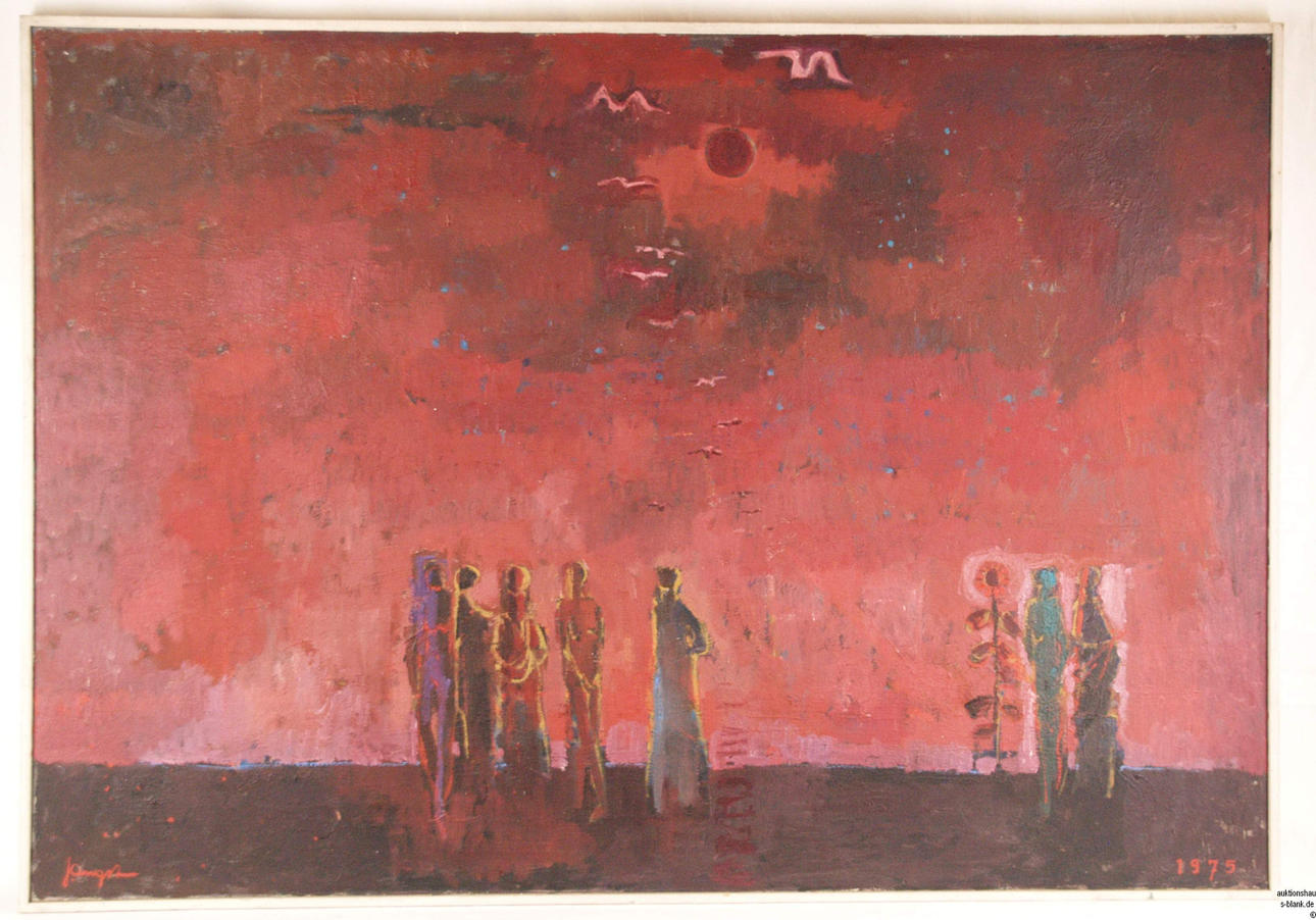 Angst,Jules (1909 Ebnat Kappel - 1989 Zürich) - Rote Landschaft mit Figurenstaffage,Öl auf Hartfaserplatte, links unten signiert "JAngst"und rechts datiert "1975", ca.78x113cm, Atelierrahmen.