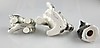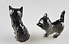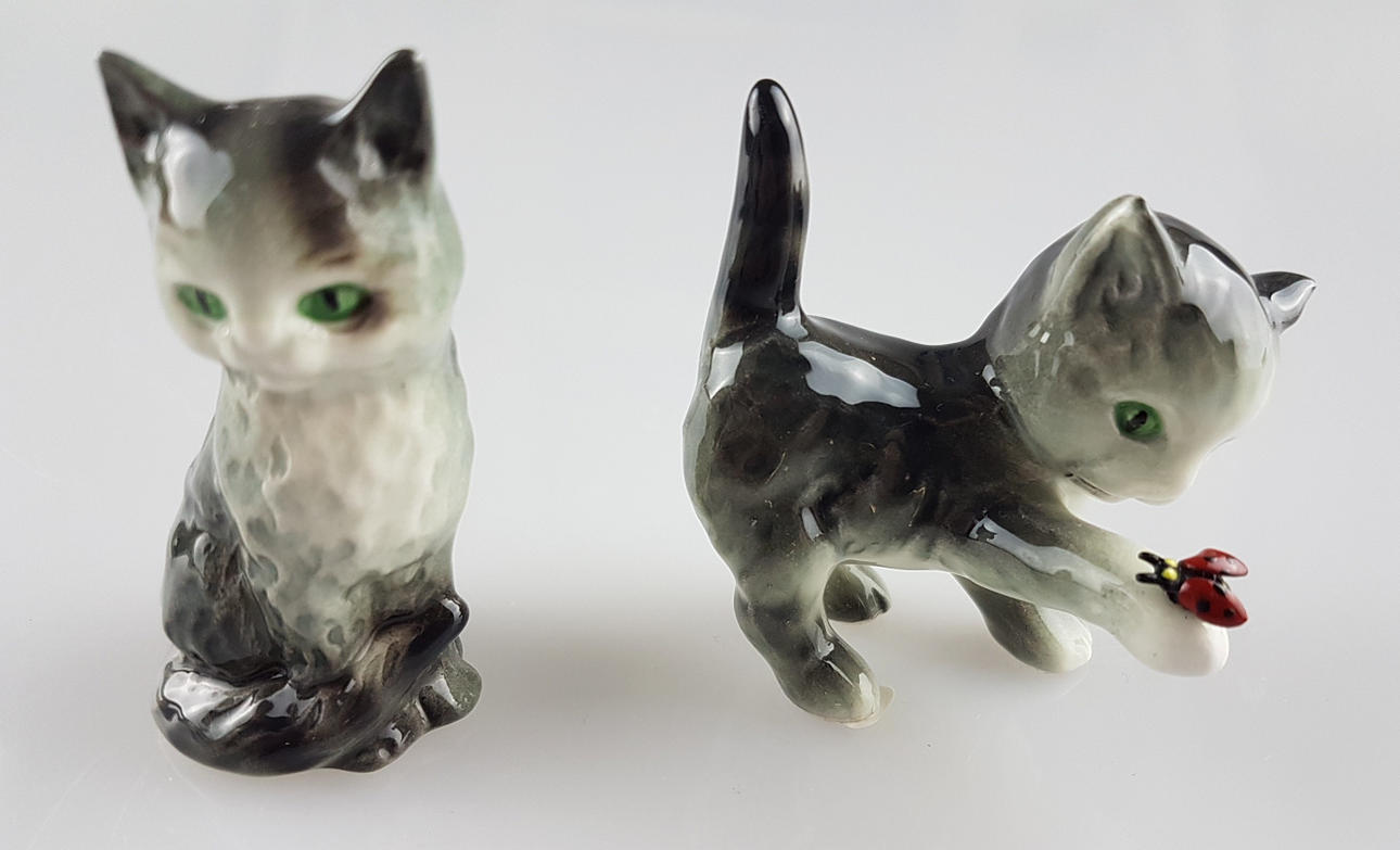 Konvolut Katzenfiguren Goebel - 3-tlg., 2 spielende und 1 liegende Katze(n), alle grünäugig, naturalistsich in grauen Farbtönen bemalt, 1x mit beweglichem Marienkäfer an der Pfote, H.ca.6/7/11cm.