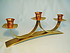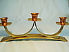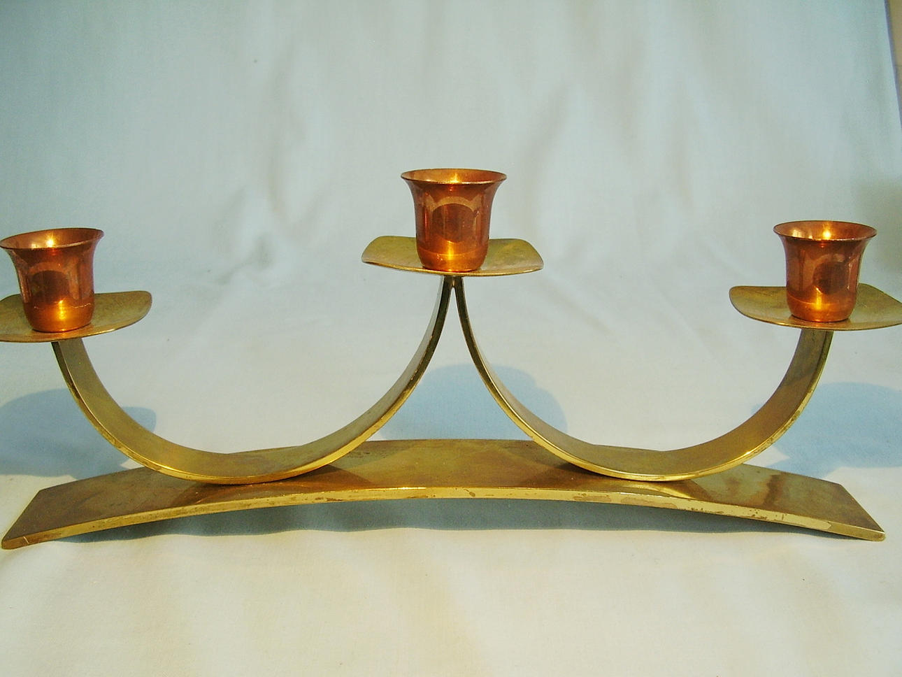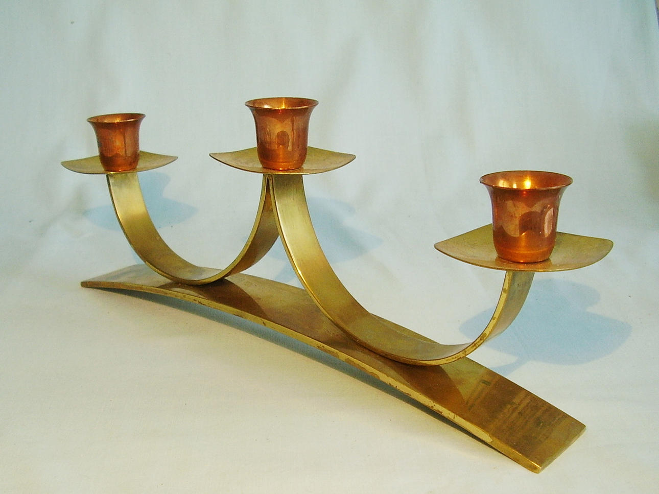 Auf einem breiten, leicht gewölbten Bronzeband erheben sich über geschwungene Bänder drei quadratische, gerundete Tropfschalen, die tulpenförmige Kupfer-Tüllen tragen.