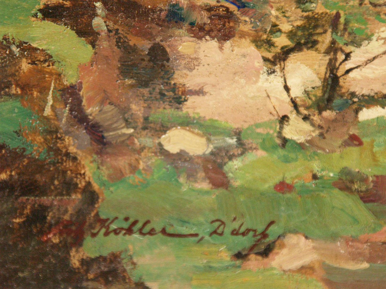 Köhler, Fritz (1887 Moritzberg - 1971 Düsseldorf, deutscher Landschafts- und Marinemaler) - Impressionistische Waldlandschaft, Öl auf Malkarton, links unten signiert "Fritz Köhler, D'dorf (für Düsseldorf)", Rückseite bezeichnet "K59", ca.27x30cm, ungerahmt.