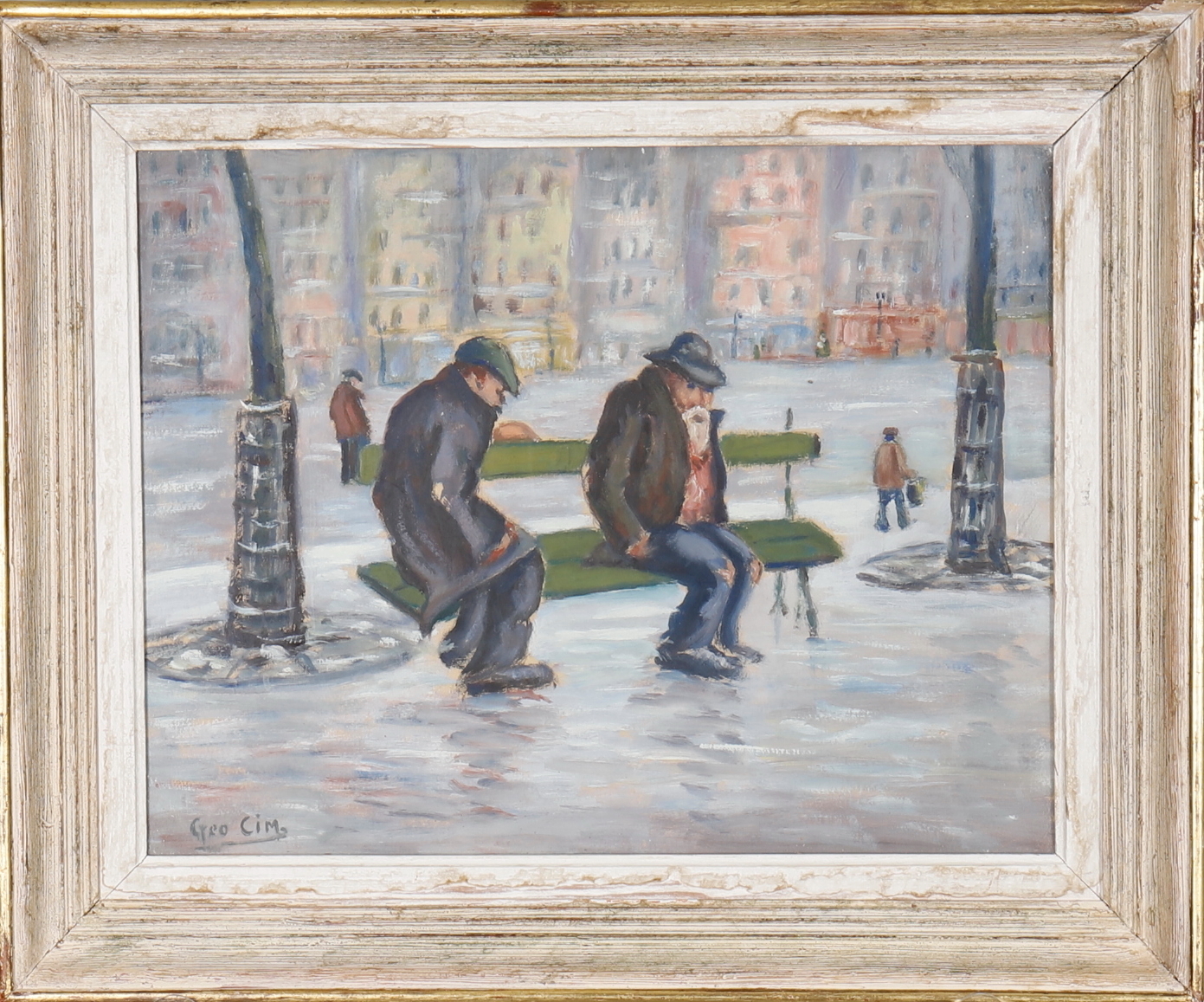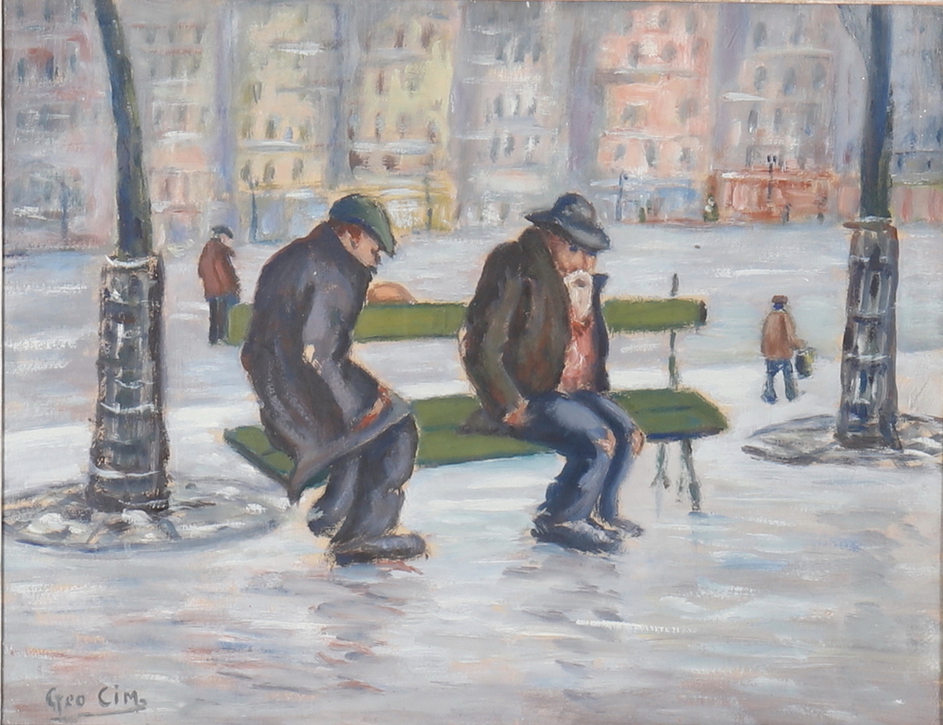 923916. GEORGE CIM (20TH CENTURY). STILLSTEHEN AUF EINER BANK.
