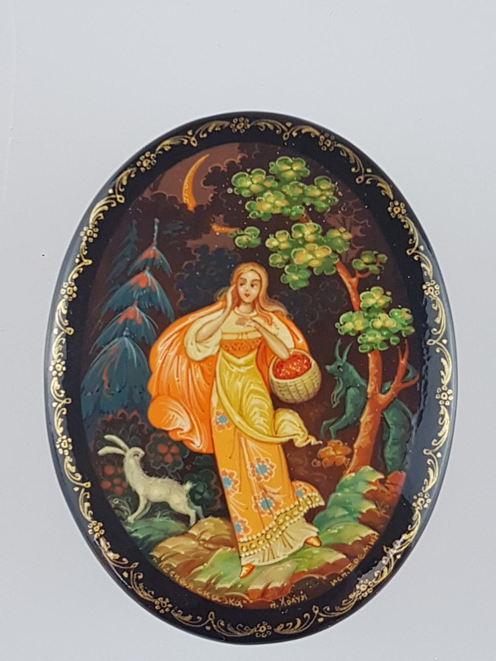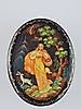 Russische Lackdose/ Puderdose - Cholui, 1985, ovale Form, Holz, schwarz lackiert, Deckel polychrom bemalt mit Motiv "Waldmärchen / Im Wald", Goldstaffage, innen rot lackiert, in Kyrillisch signiert "Eremin", betitelt und ortsbezeichnet, L.ca.6,2cm.