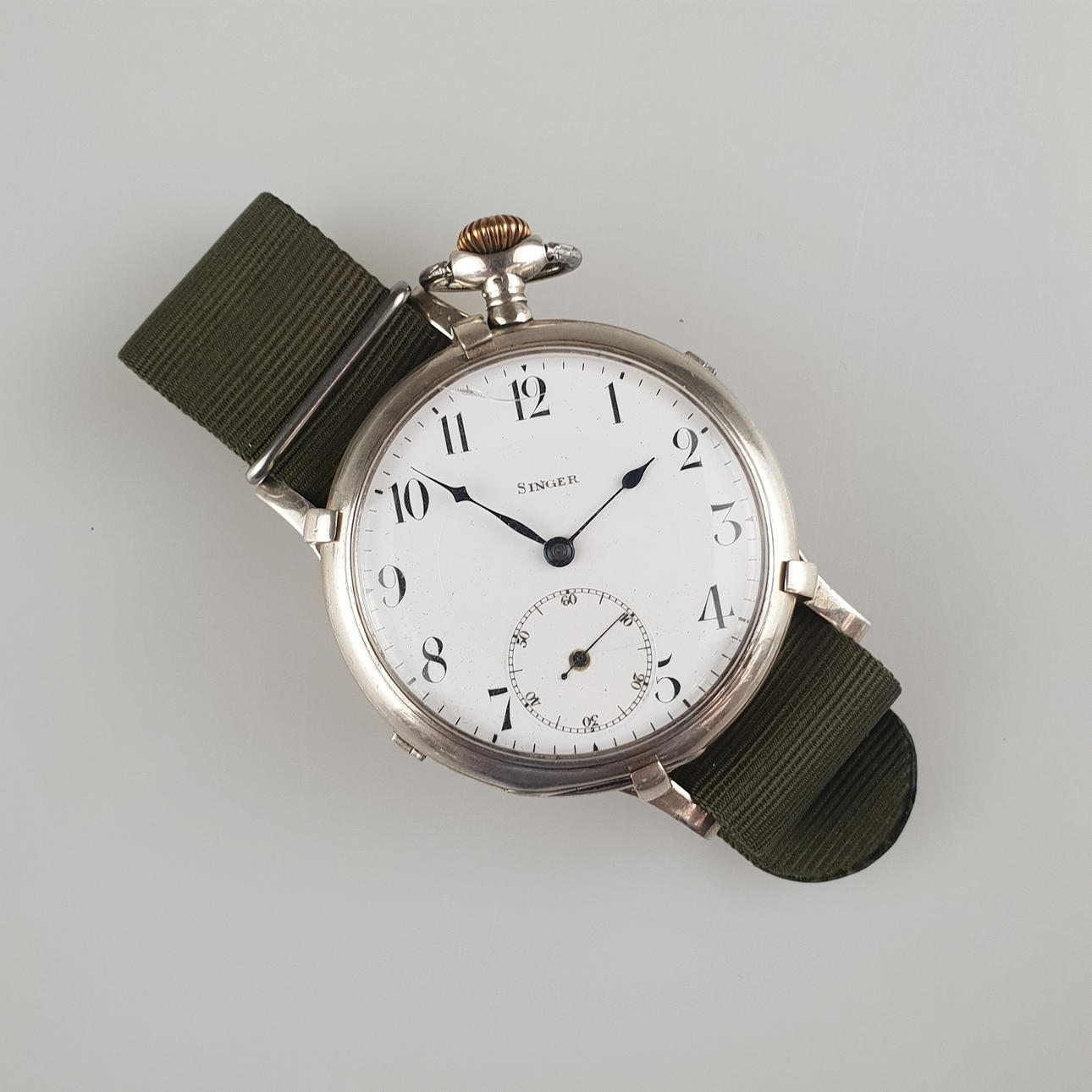 Taschenuhr mit Armband - Longines Werk, Silbergehäuse, weißes Emailzifferblatt mit arabischen Zahlen bezeichnet "Singer", Sekunde bei 6 Uhr, funktionsfähig, Stoffarmband ergänzt,D.ca.5cm.