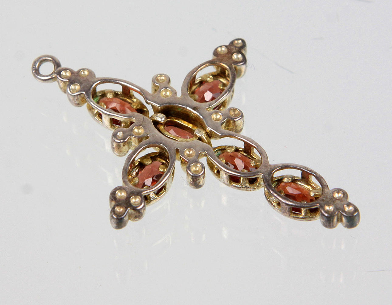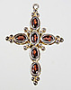 Anhänger ist in Silber 925 nicht punziert aber fachmännisch geprüft, der Anhänger ist in Form eines lateinischen Kreuzes gearbeitet und mit 6 facettierten Granaten besetzt, Länge 38 mm, Breite 26 mm, Gewicht 3,5 Gramm.