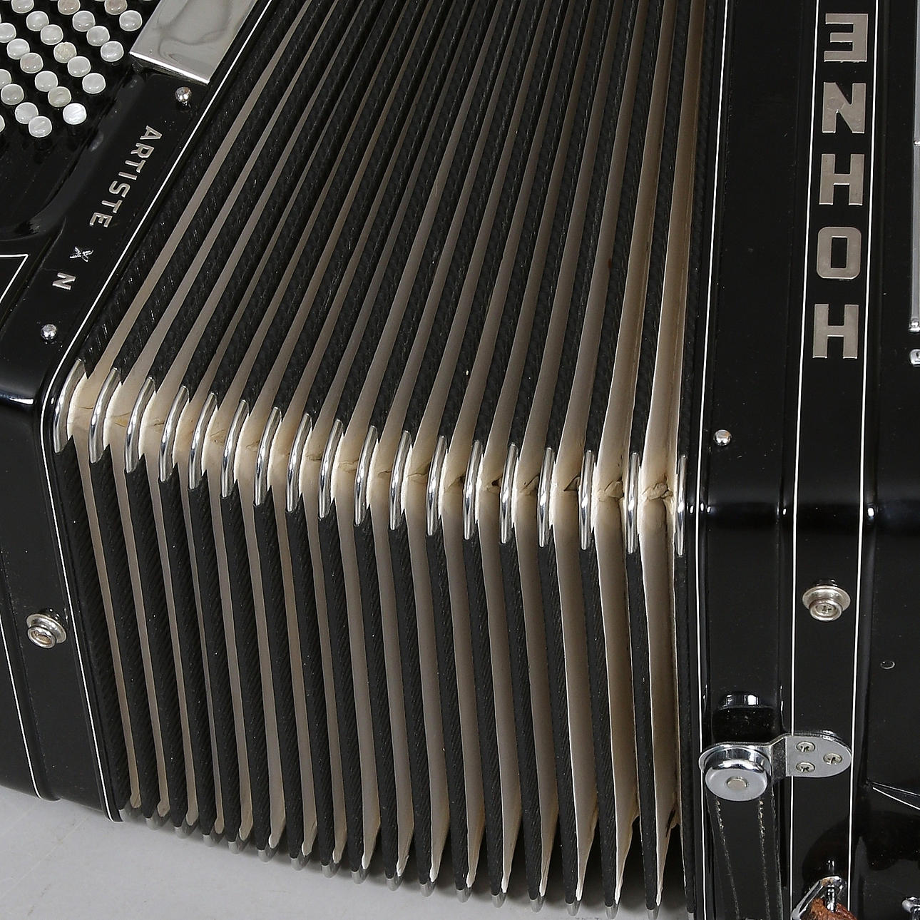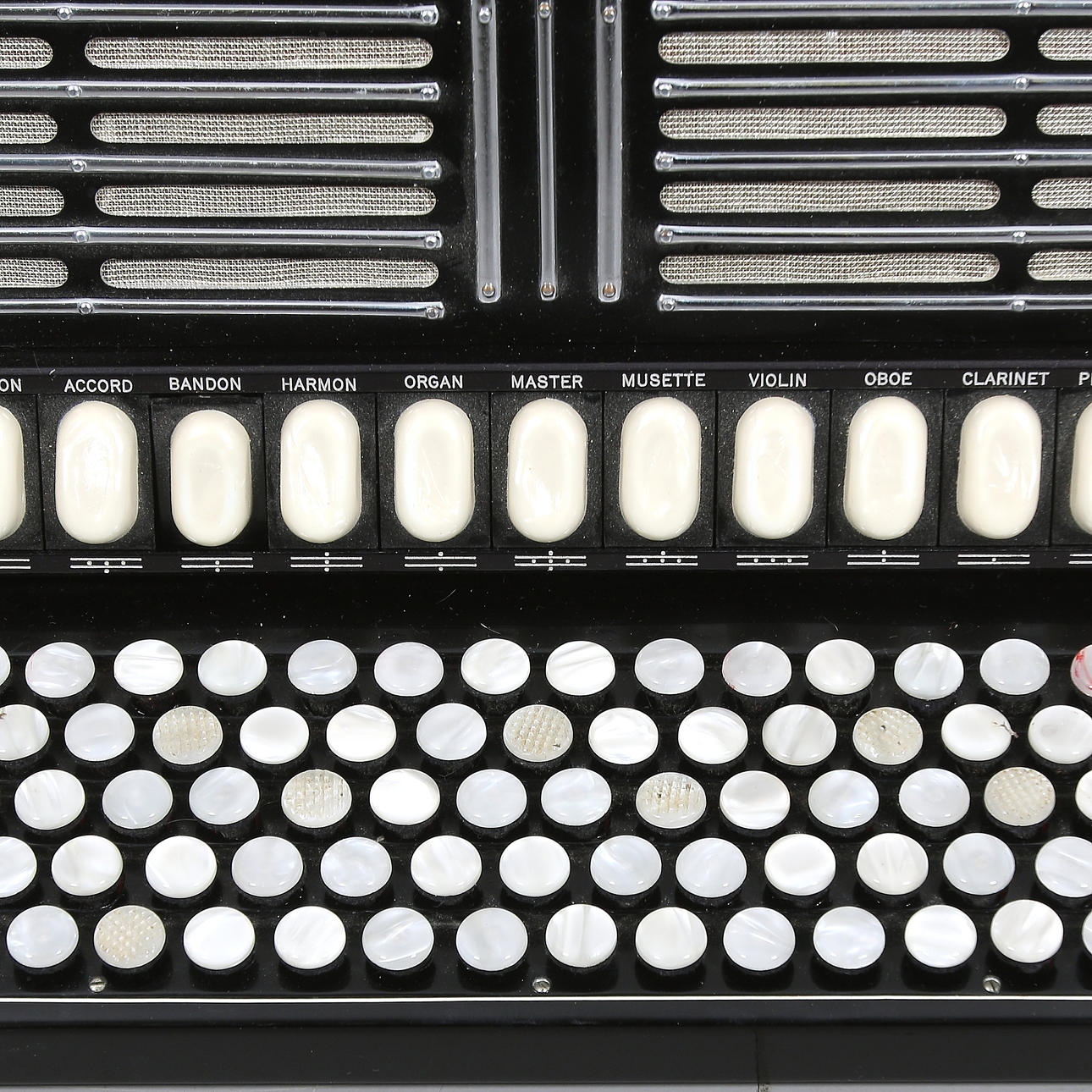 4 Chöre und 11 Register im Diskant. 9 Reihen, davon die innerste mit Melodiebasis und 3 Register in der Basis.