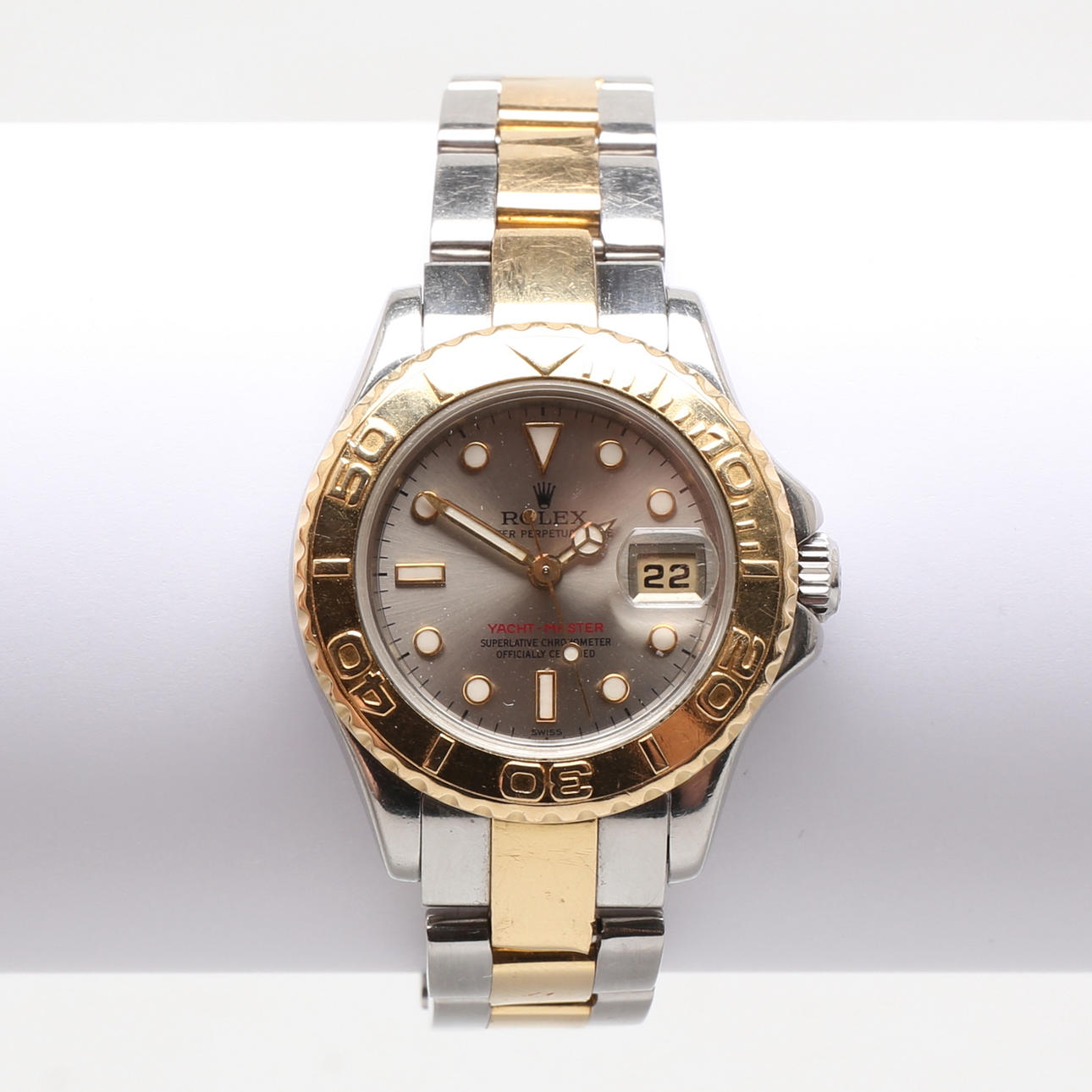 Rolex Oyster Perpetual Date Yacht-Master Damenarmbanduhr, Midsize, Ø 29 mm. Armband und Gehäuse aus Gold und Stahl. Silberfarbenes Zifferblatt mit Leuchtindizes. Ref. 169623.