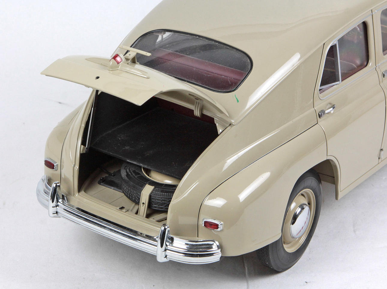 Blech lackiert, ungemarkt, russische Pobeda Limousine, Motorhaube, Heckklappe sowie beide Vordertüren zu öffnen, L ca. 58 cm, B ca. 20 cm, H ca. 22 cm.