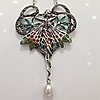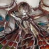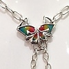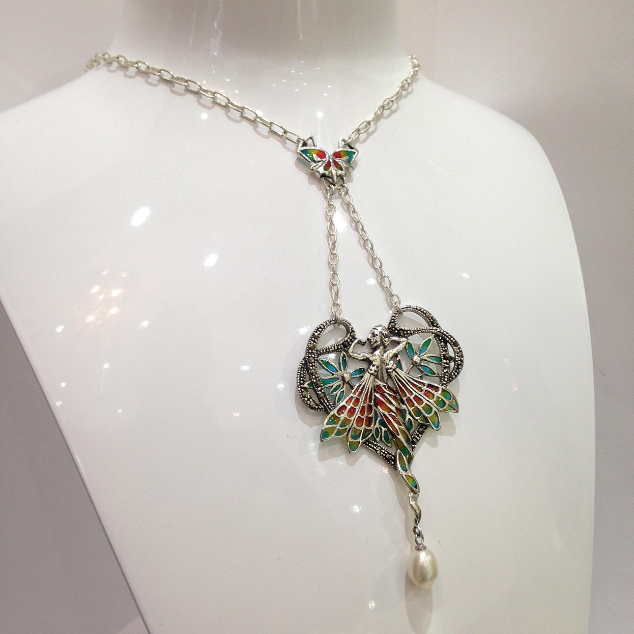 Eine silberne Dame im Jugendstil mit Emaille, Perle und Markasit. Diese Halskette ist aus Silber (gestempelt "925"). Diese Halskette ist mit einer einzelnen Perle und Markasitsteinen besetzt. Die Flügel und der kleine Schmetterling sind mit roter, grüner und gelber Emaille besetzt.