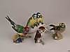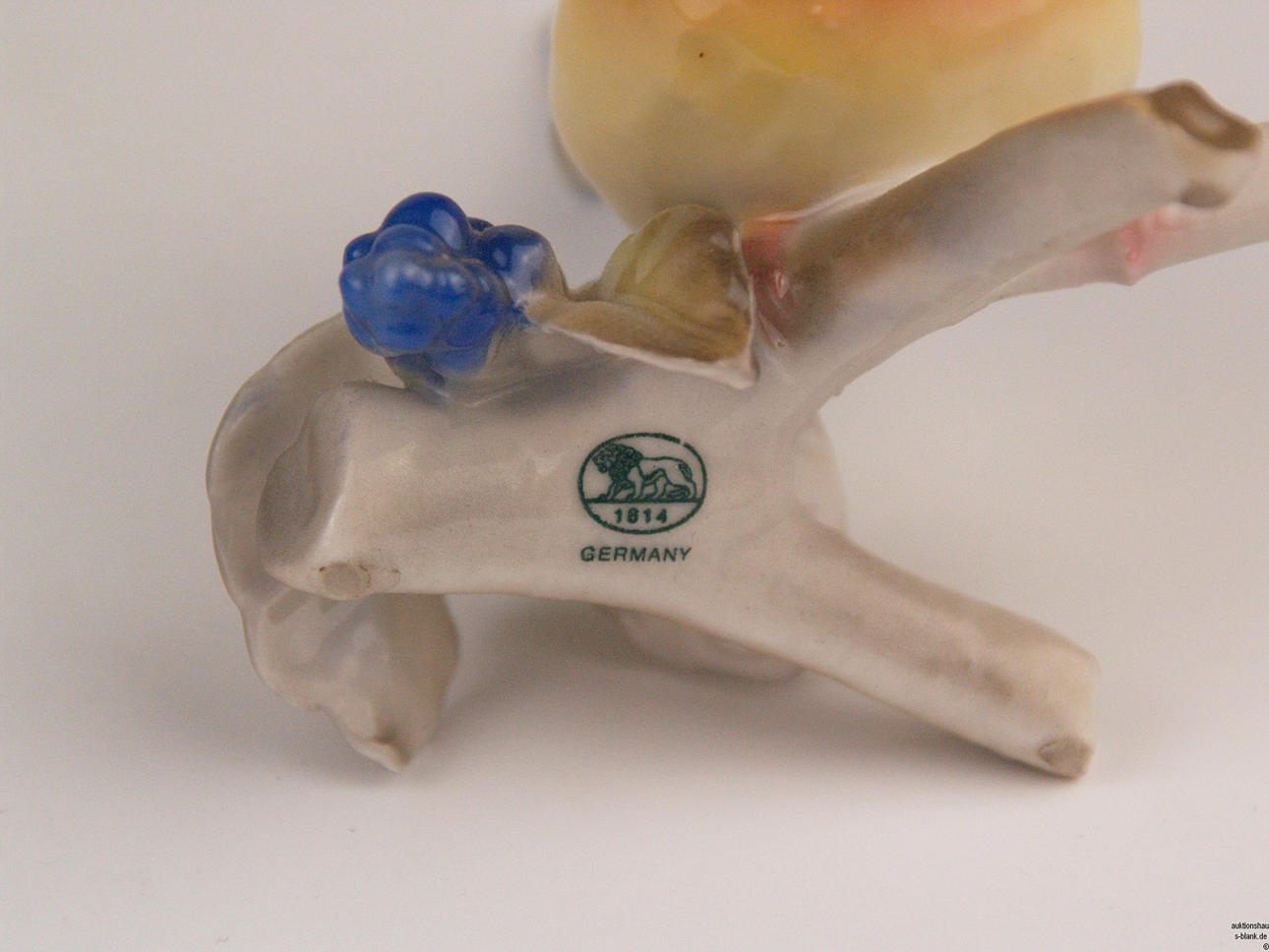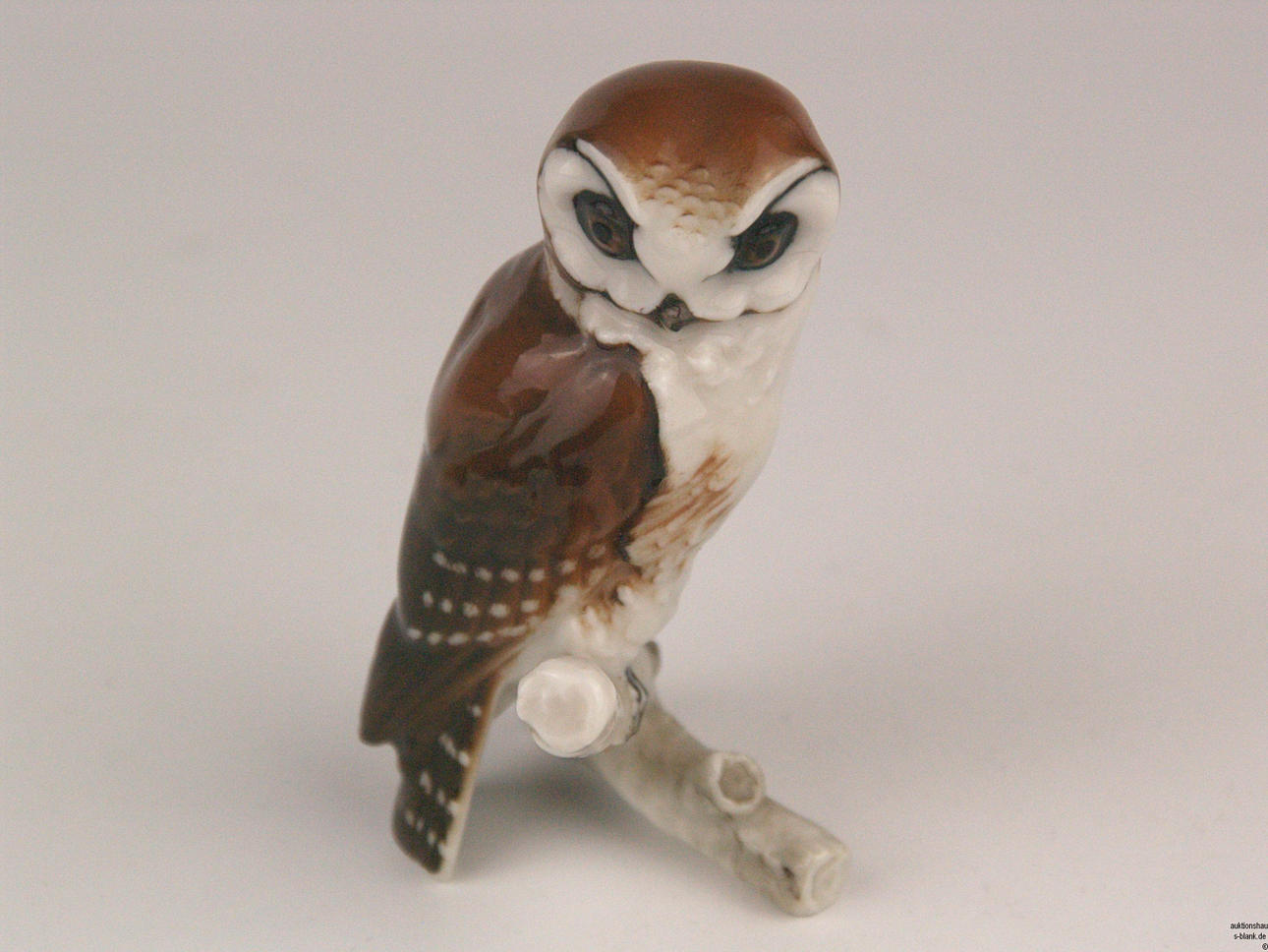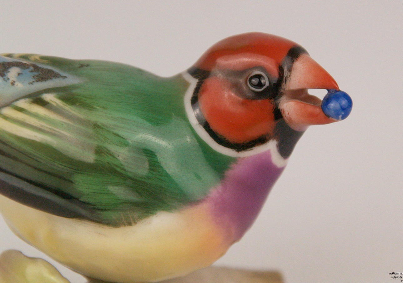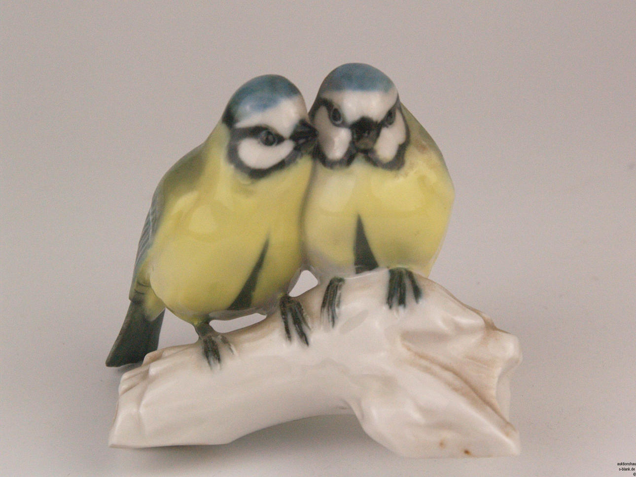 Konvolut Porzellan-Vogelfiguren - Hutschenreuther, alle mit grüner Löwenmarke,naturalistisch bemalt,4-tlg: 1x Eule auf Ast sitzend, H.ca.7cm/ 1x Meisenpaar auf Ast sitzend, Entwurf von Lydia Foucar, H.ca.9cm/ 1x Vogel auf Astsockel mit Beere im Schnabel, H.ca.9,5cm/ 1x Vogel auf naturalistischem Sockel, H.ca.8,5cm.