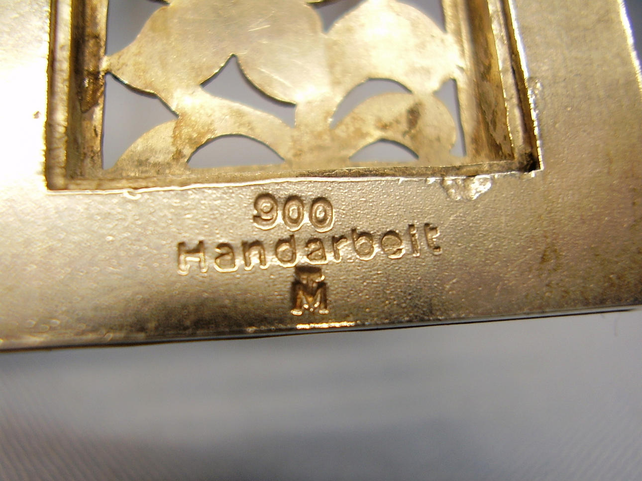 Der Anhänger ist in Silber 900 gearbeitet und auch so auf der Rückseite punziert. Dazu trägt der Anhänger das Meisterzeichen von Theodor Müller, dem Hofjuwelier zu Weimar, der für den Hof des Großherzogs von Sachsen arbeitete.