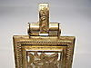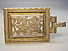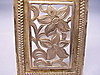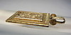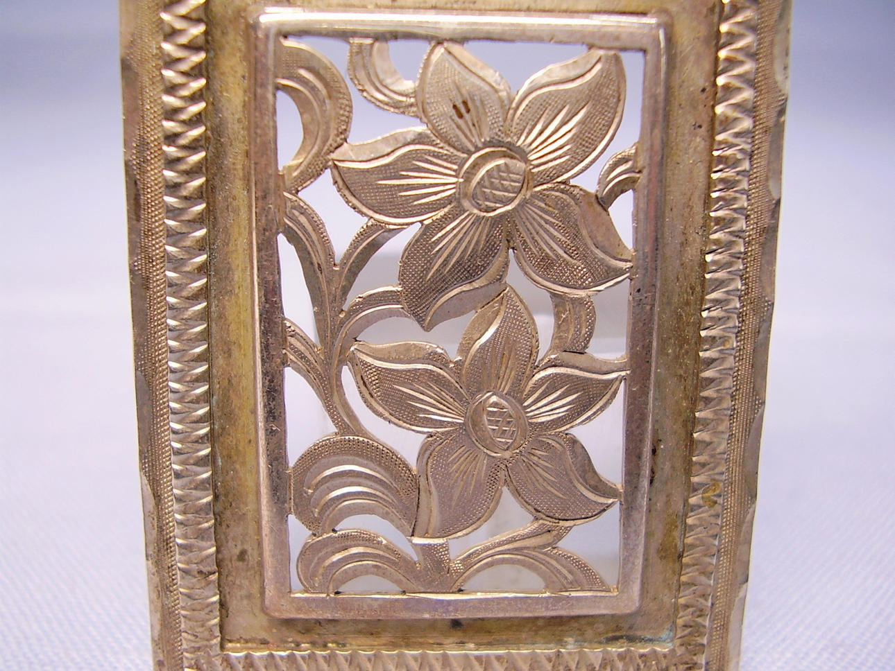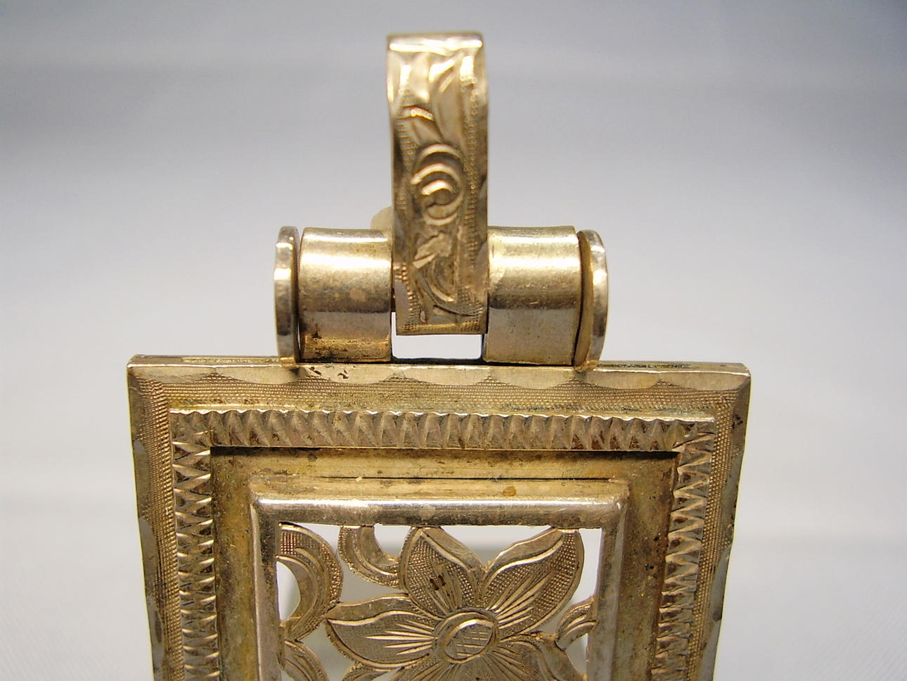 Der Anhänger hat eine rechteckige Form und trägt einen von Hand ausgesägten Einsatz aus handgravierten Blüten und Blättern, umgeben von einem fein ziseliertem Rahmen. Auch die bewegliche Trageöse ist floral verziert in Handstichel-Gravur.