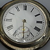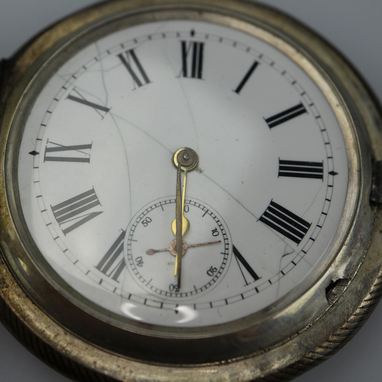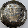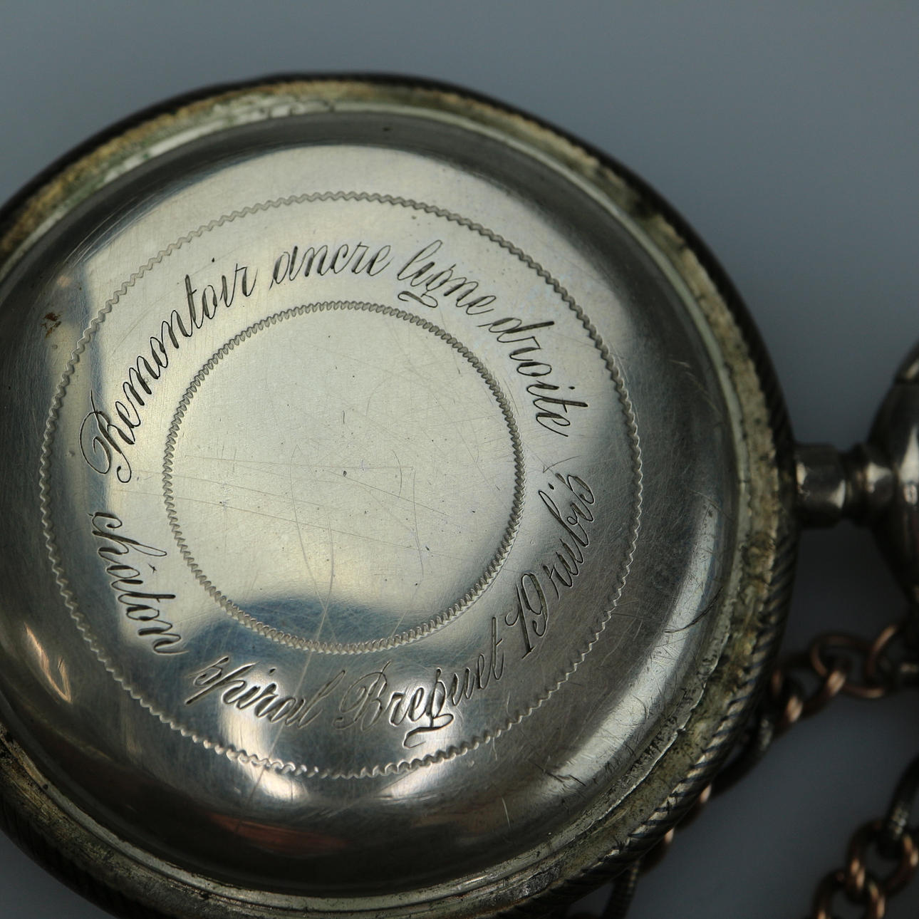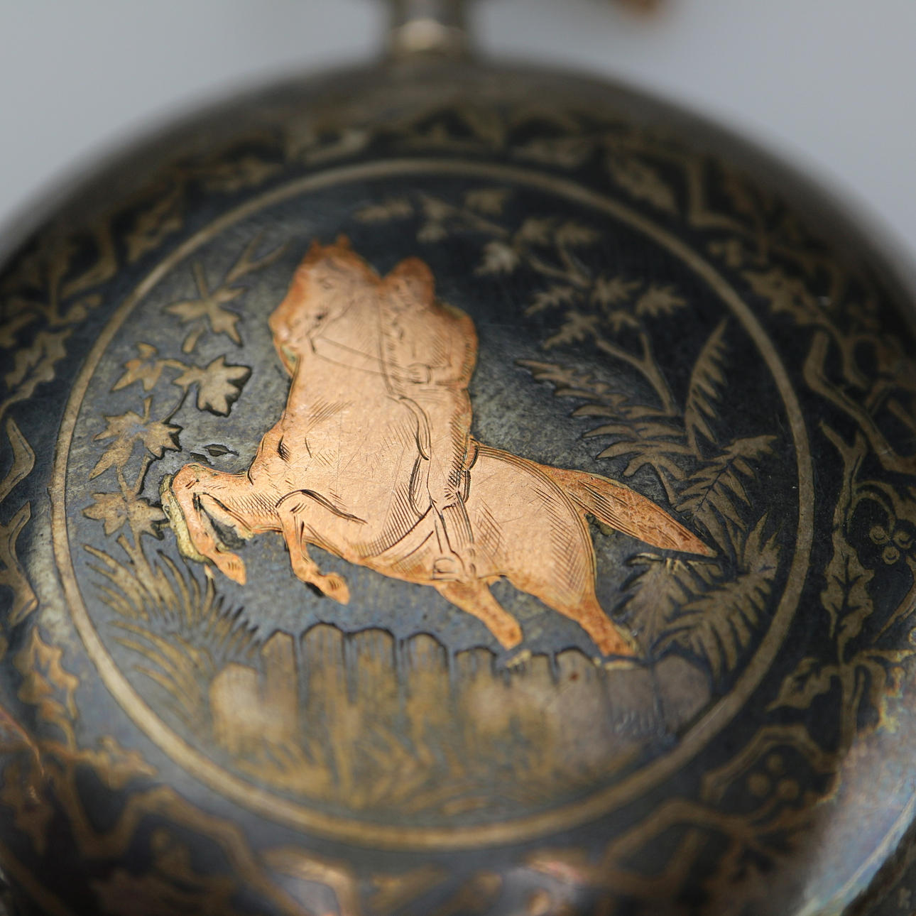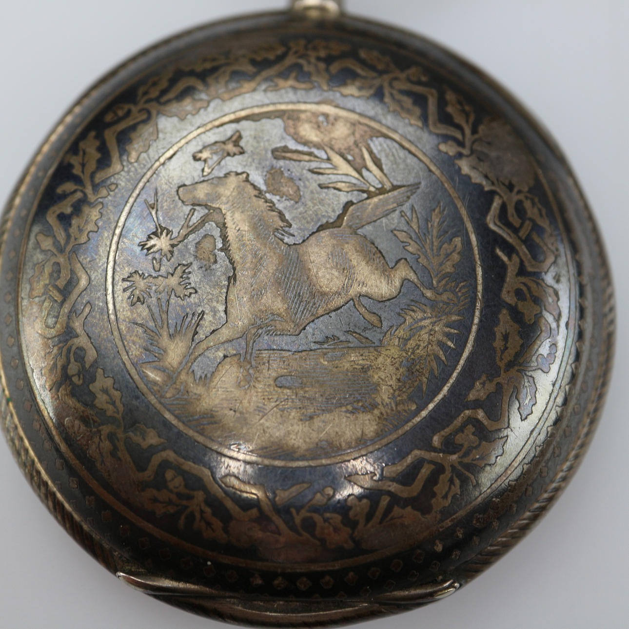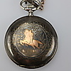 Silberne Taschenuhr in Niello-Technik, Springreiter auf dem Frontdeckel, galoppierendes Pferd auf dem Rückdeckel. Gravur auf der inneren Rückseite: "Remontoir ancre ligne droite - chaton spiral Breguet 19 rubis." Handaufzug, Sprungdeckel, Ziffernblatt mit 40 mm Durchmesser, Gesamtdurchmesser 55 mm. Seriennummer: 92767 Versilberte Kette. Uhr lief bei der Katalogisierung - keine Funktionsgarantie.