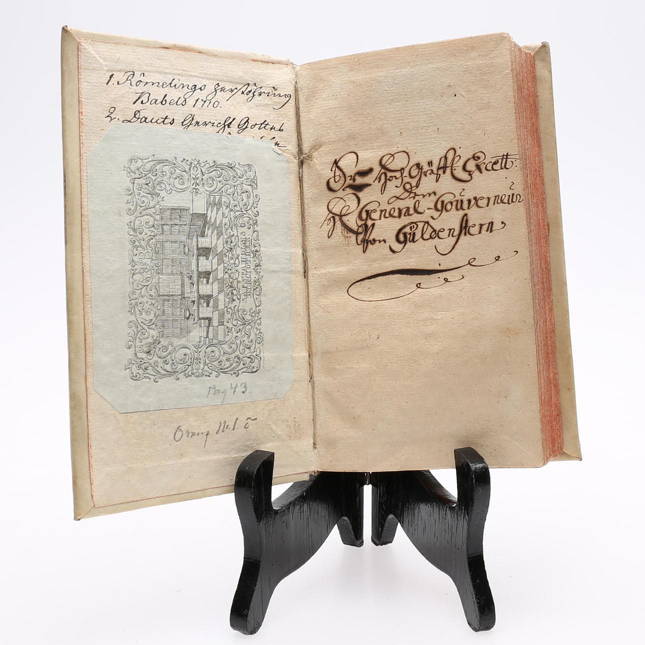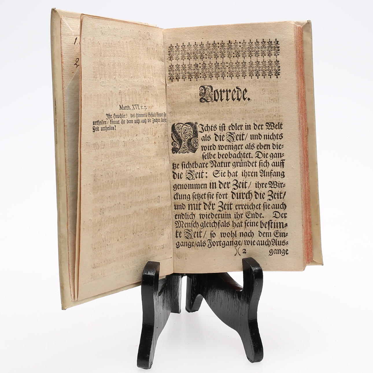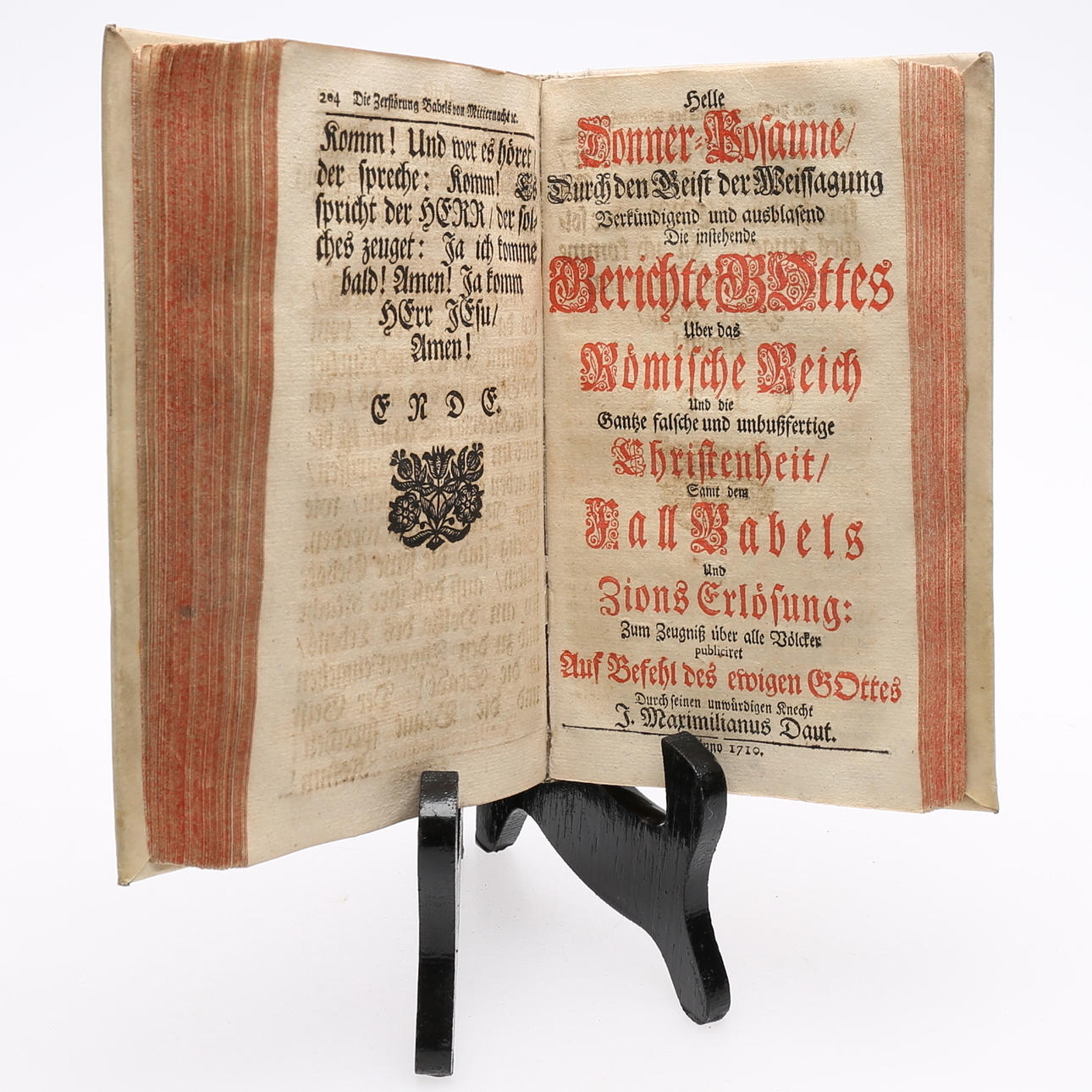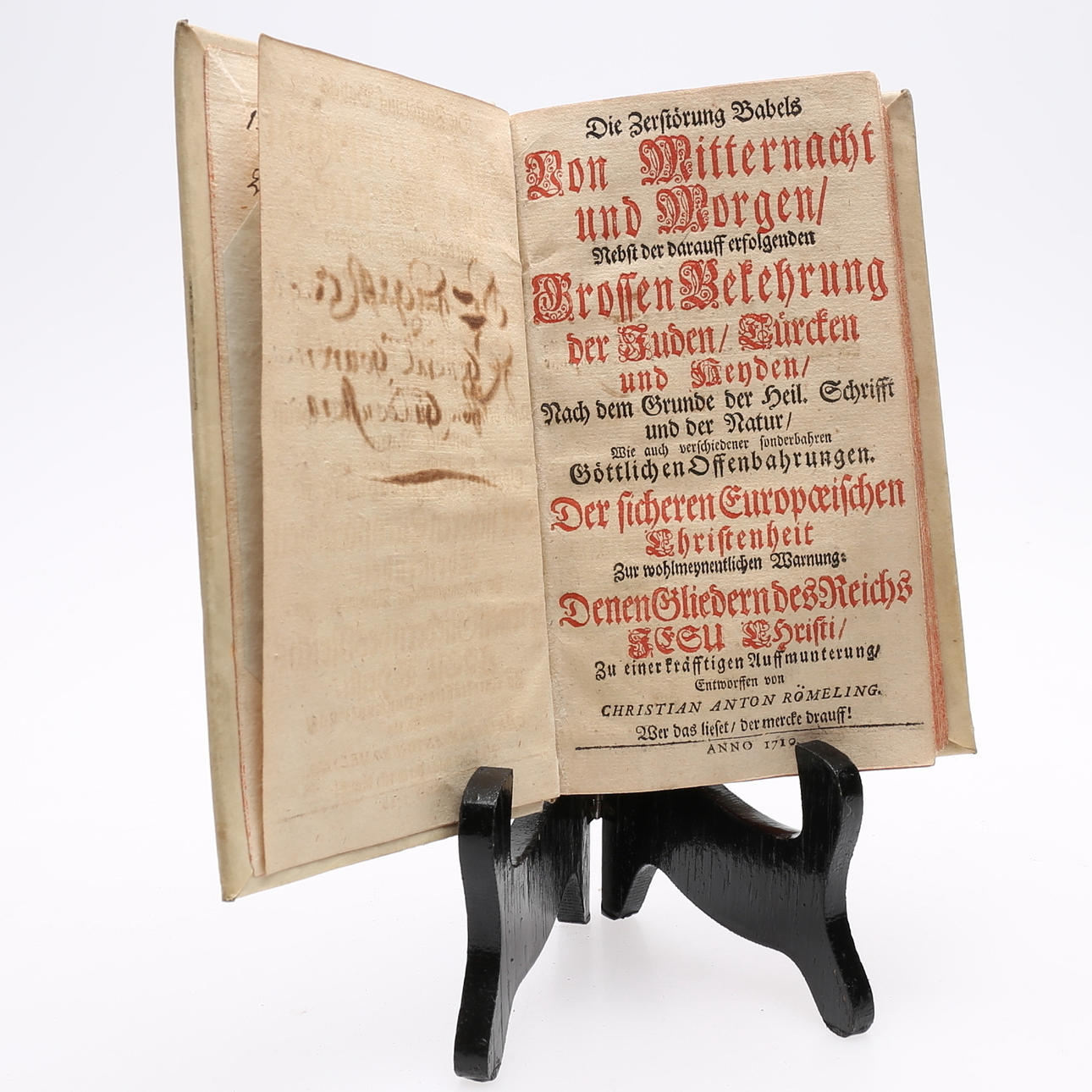 Römerling, Christian Anton. Die Zerstörung Babels von Mitternacht und Morgen, nebst der darauf naftenden grossen Bekehrung der Juden, Türcken u. Heyden. Christian Anton Römeling, ohne Druck, 1710. 8vo in einem zeitgenössischen, blindverzierten Pergamenteinband mit handschriftlichem Rückentitel. (XII), 204 S. Gebunden mit Daut, Johannes Maximilian. Helle Donner-Posaune, durch de von Johann Maximilian Daut. Helle Donner-Posaune, durch den Geist der Weissagung verkündigend und ausblasend die in den Gerichten Gottes stehenden über das Römische Reich und die ... J. Maximilianus Daut, ohne Ort, 1710. (II), 166 S. Beide Titel in Rot und Schwarz gedruckt. Mit Säfstaholms Exlibris.
