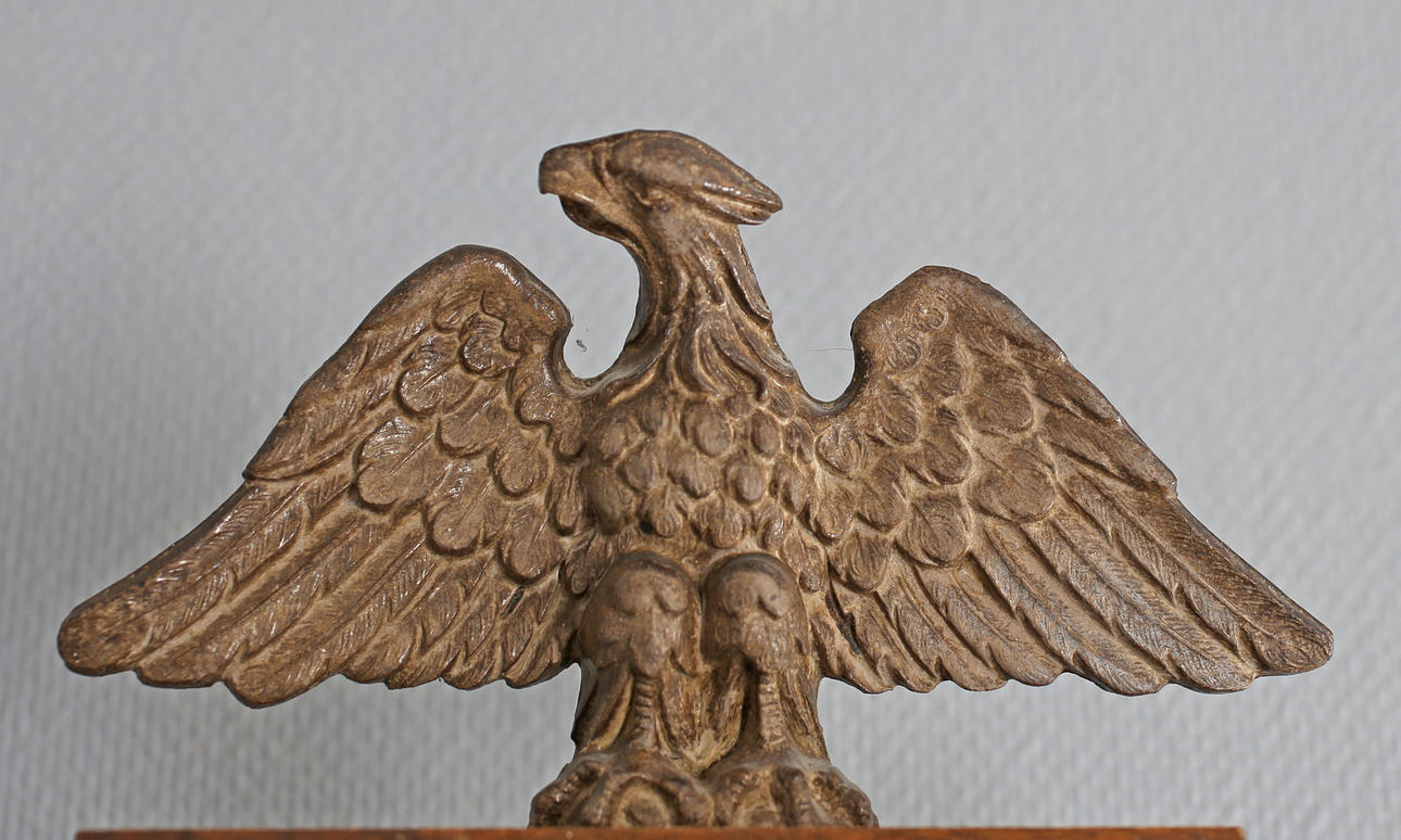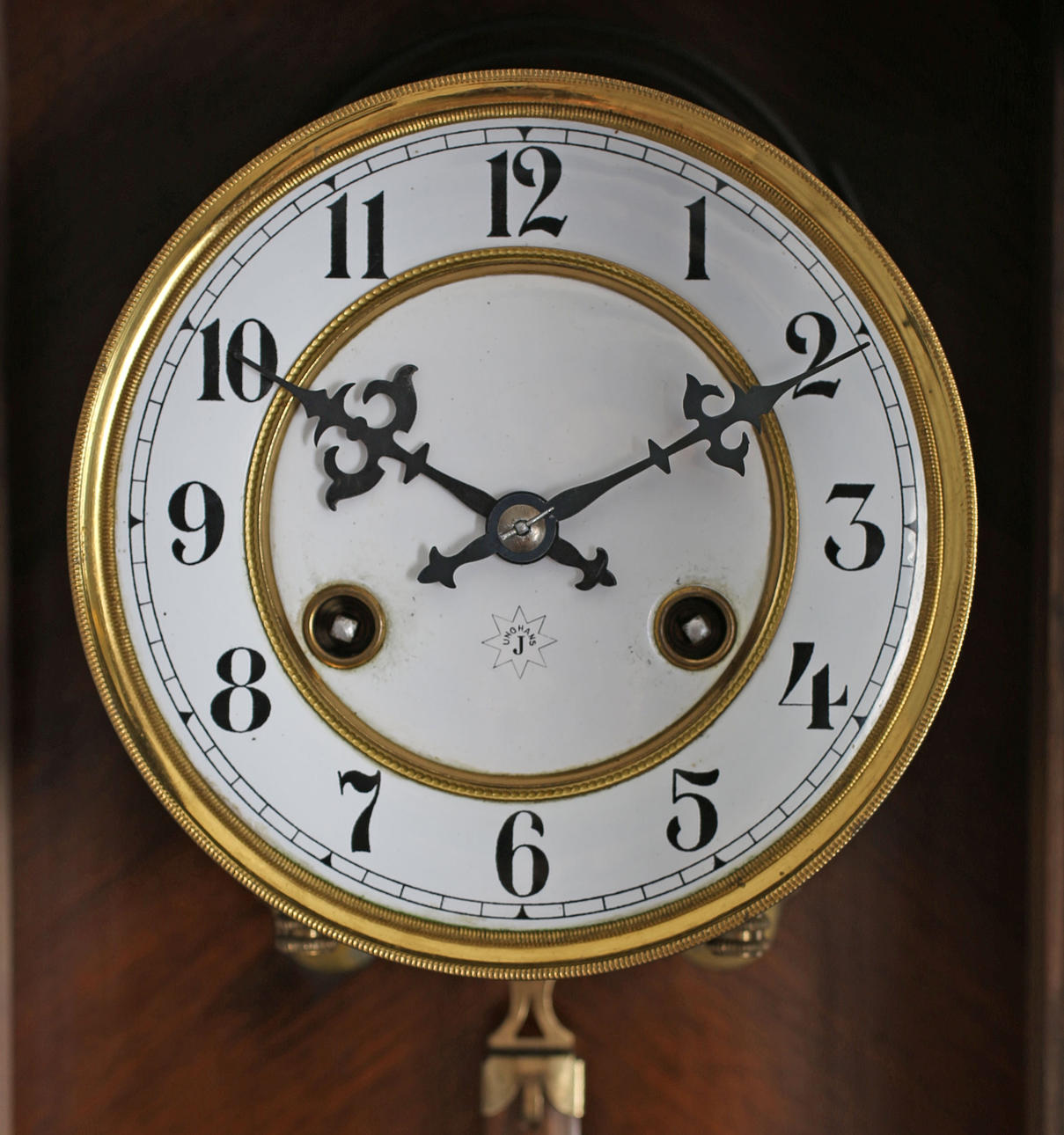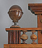 Gebeiztes und lackiertes Holz. Weißes Emailzifferblatt, geschwärzte römische Ziffern. Krone mit Adler und Kugeln. Schlüssel vorhanden.