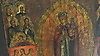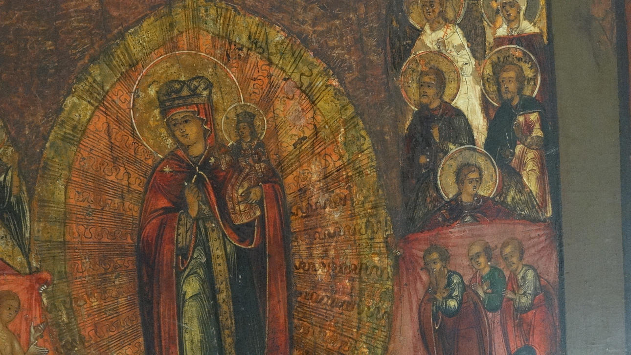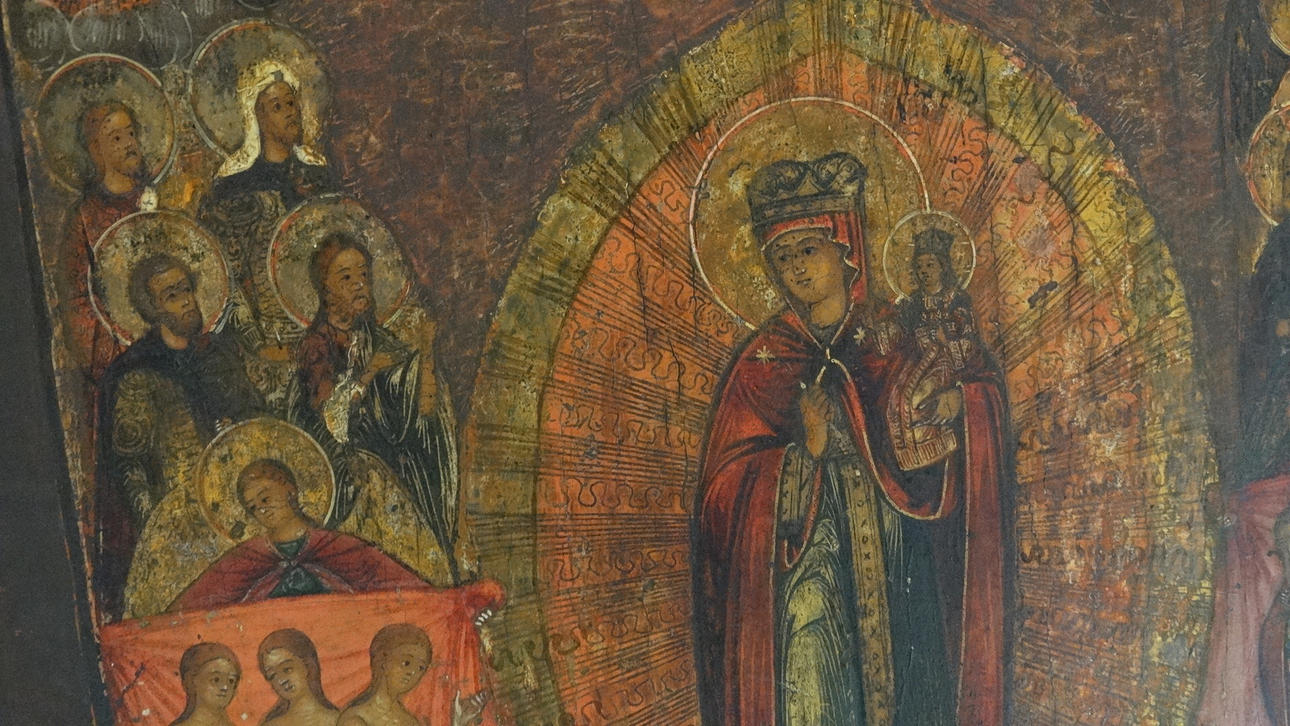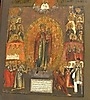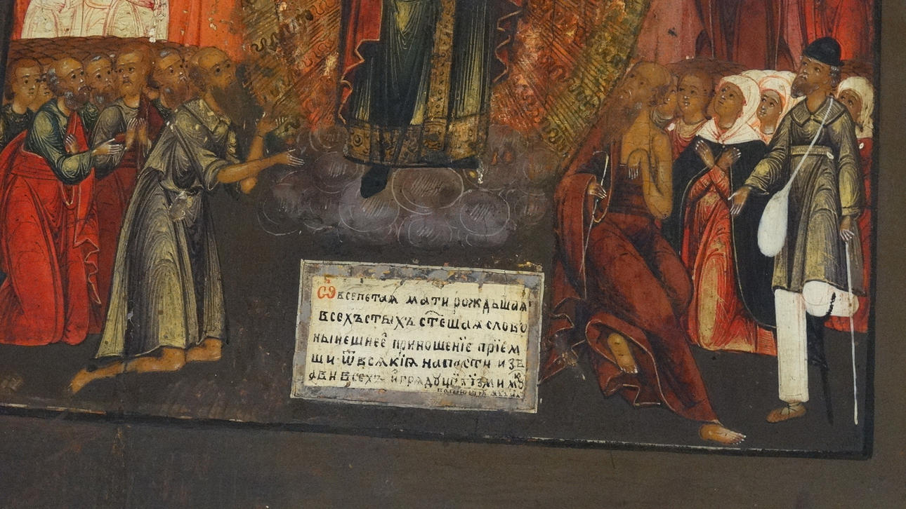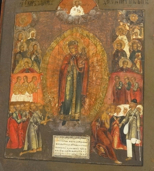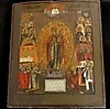 Russische Ikone, auf Kiefernholztafel gemalt, mit Naturfarben, Mariendarstellung mit Heiligen und Geistlichen, etwa 30 x 36 x 2 cm, um 1800.