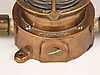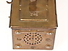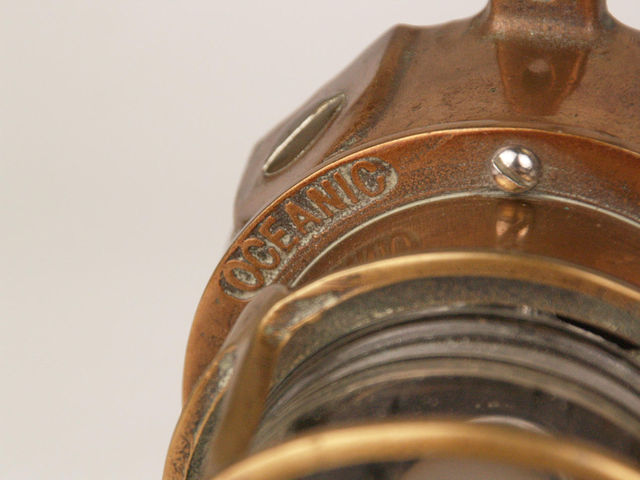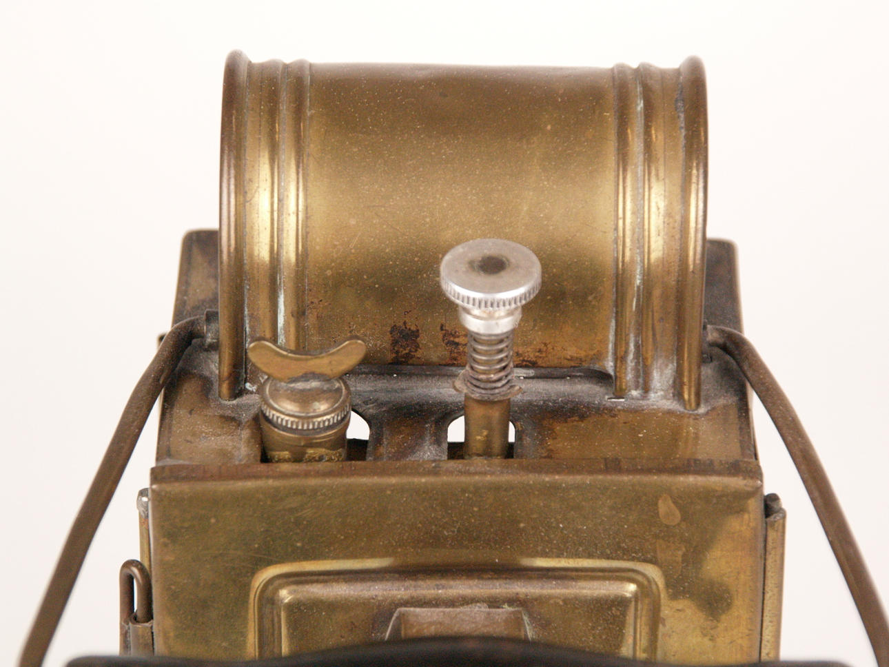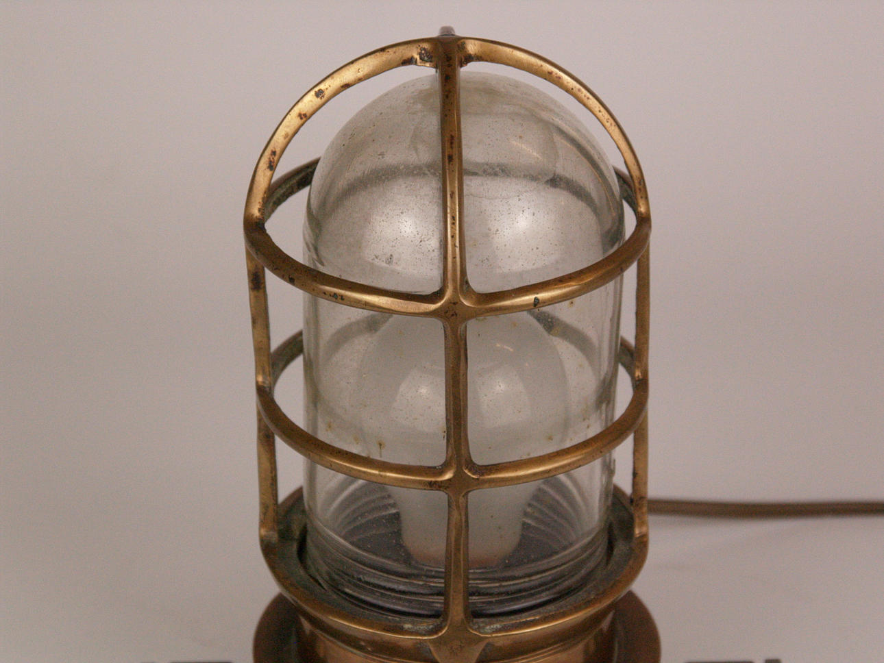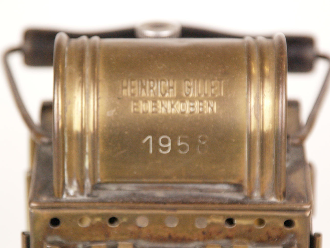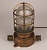 2 Lampen - 1x Schiffslaterne, "Oceanic", Messinggehäuse, Glaszylinder, elektrifiziert, H.ca. 24cm; 1x Petroleumlampe, Messing/Glas/Holz, bezeichnet "Heinrich Gillet Edenkoben 1958", verso Flügelrad-Symbol, mit Tragegriff, H.(ohne Griff):ca.22cm.