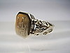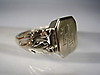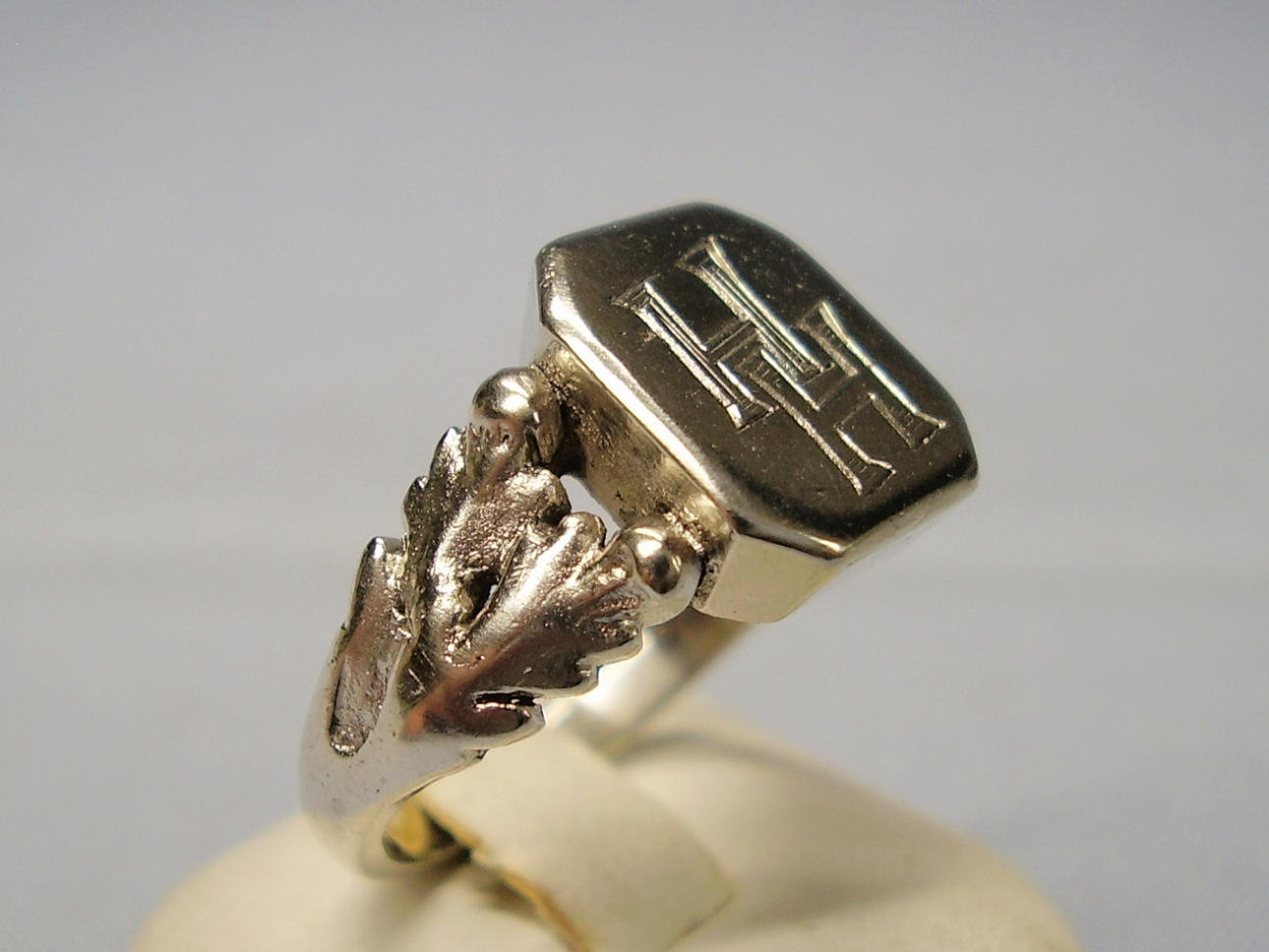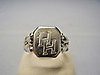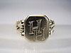 Der Ring hat einen oktogonalen Ring-Kopf in polierter Oberfläche, der mit den Besitzer-Initialen "H.H." von Hand graviert ist.