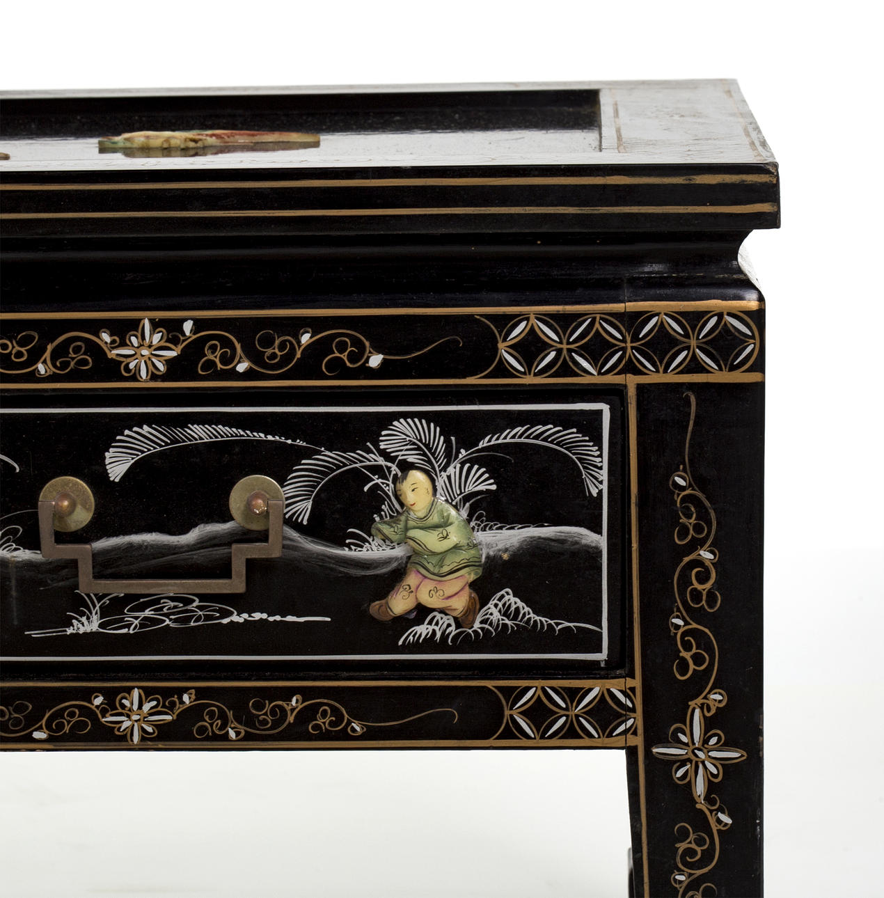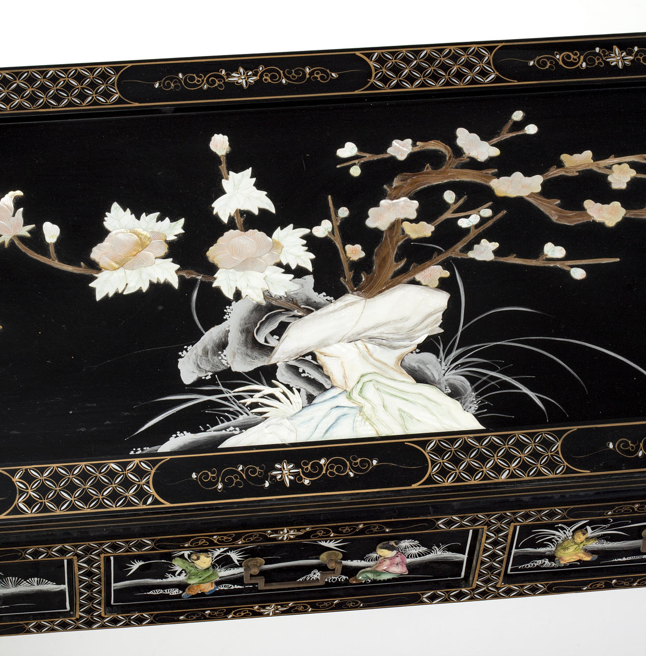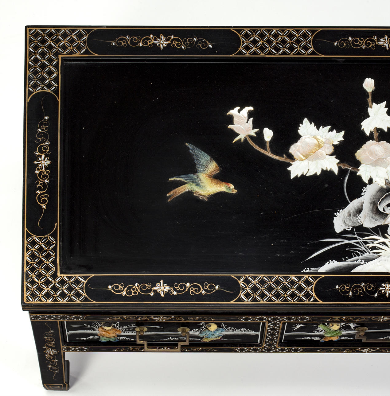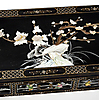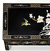 Lackiertes Holz mit Einlagen aus getöntem Perlmutt und Harz.