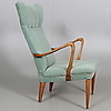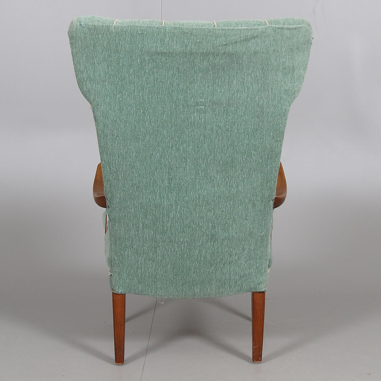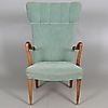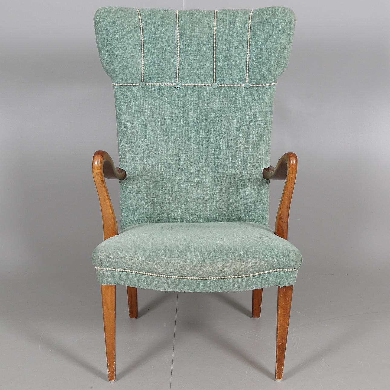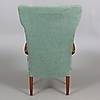 Sessel mit grünem Textilbezug, Beinen und Armlehnen aus Ulme und Gestell aus Kiefer. Länge ca. 60, Breite 61, Sitzhöhe 41, Rückenhöhe 81 cm.