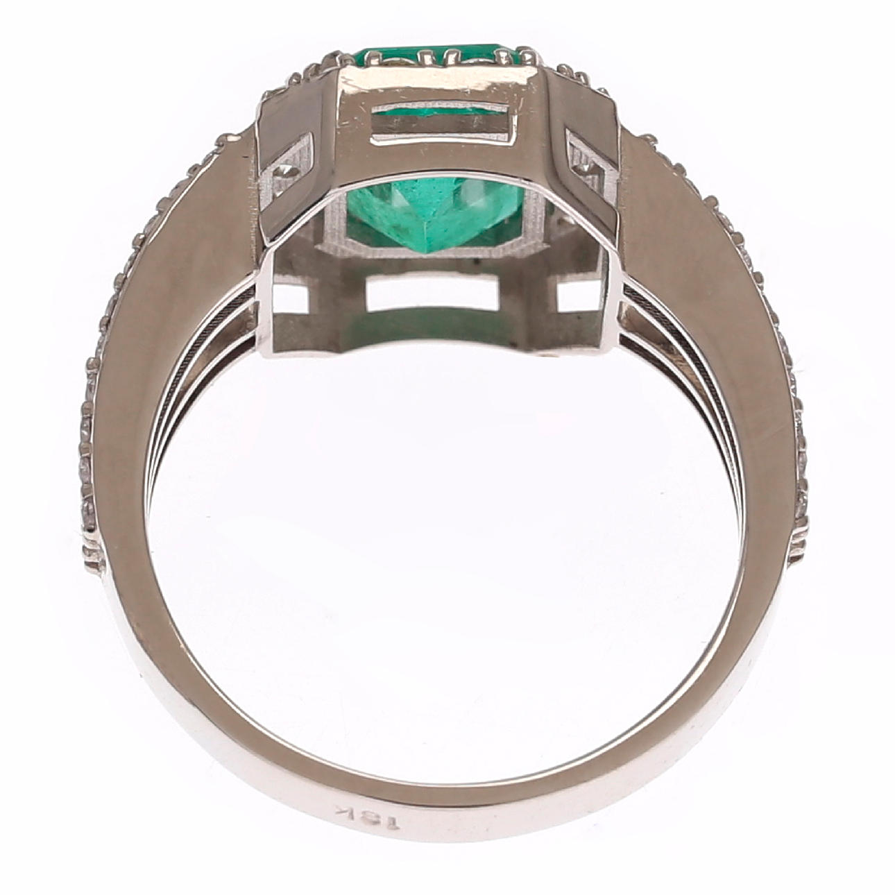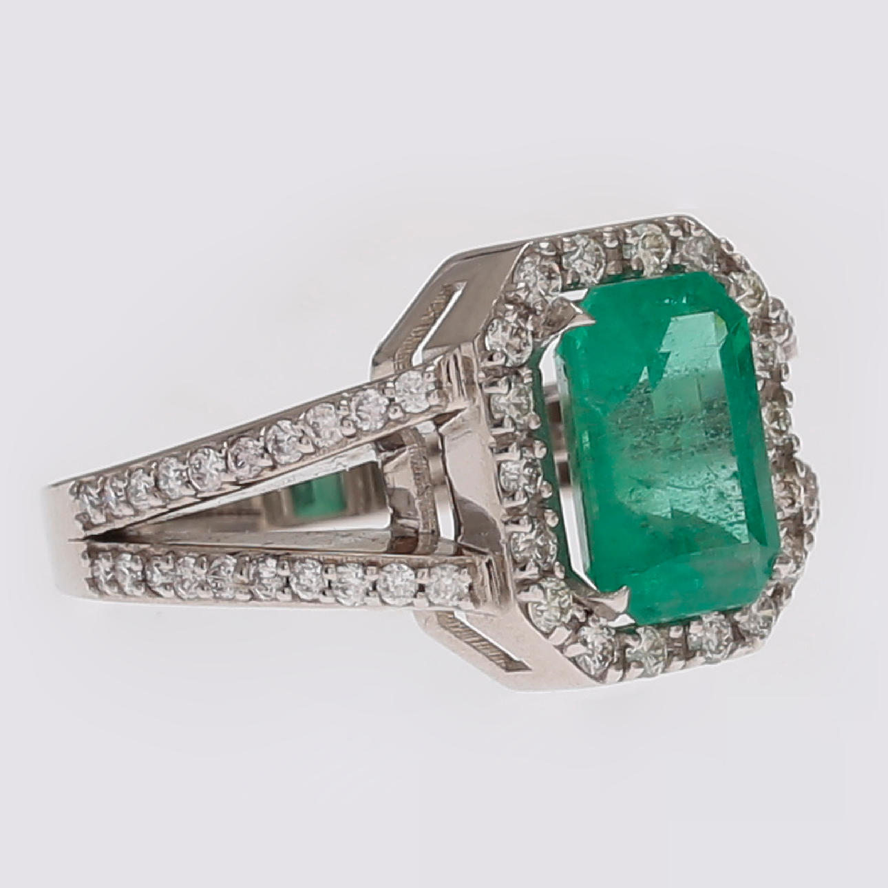 18 K Weißgold, rechteckiger Smaragd im Smaragdschliff, ca. 2,40 cts. und Diamanten im Brillantschliff, ca. 0,55 ct. Größe 15/55. 5,4 gr.