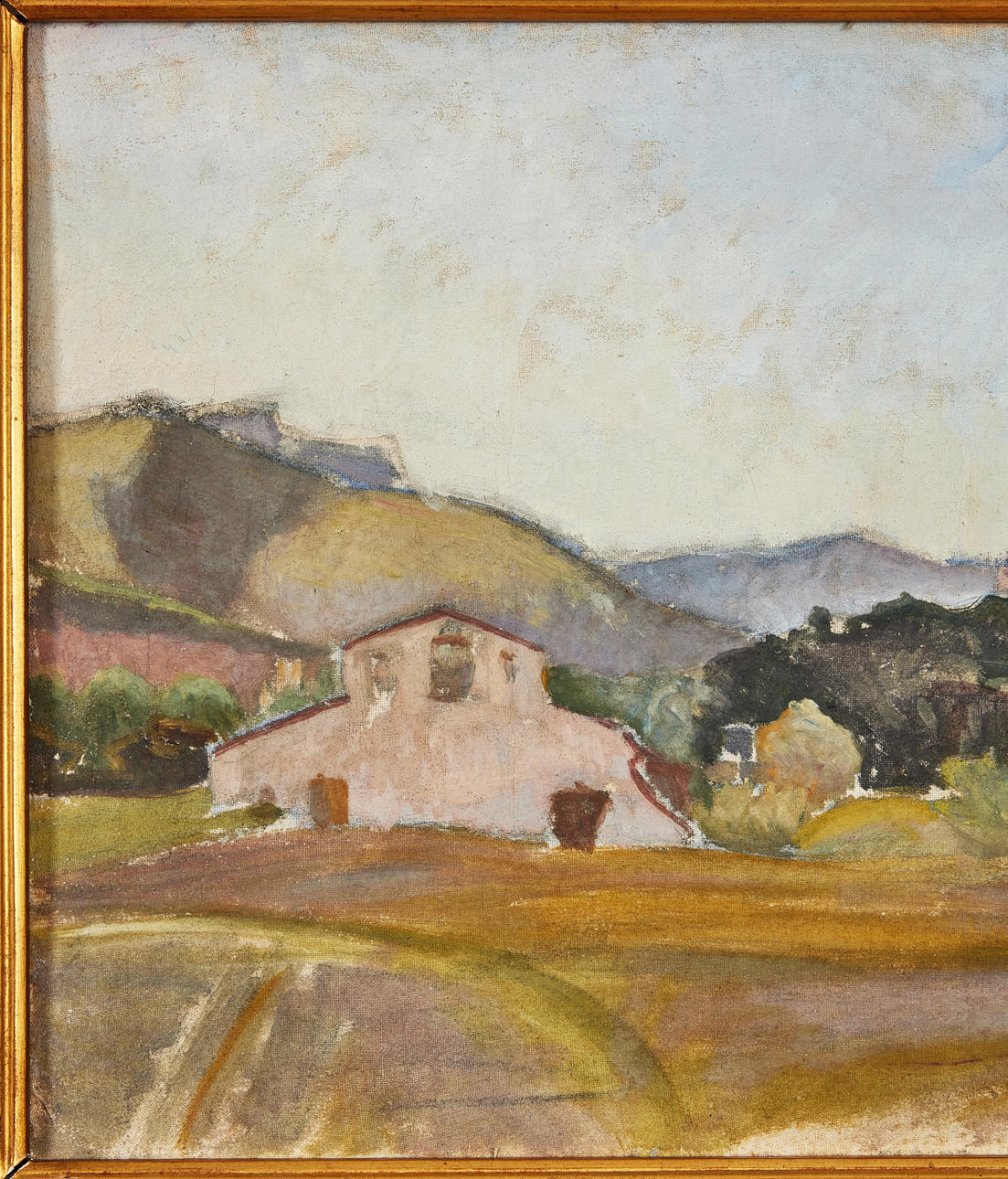 Öl auf Leinwand auf Holz geklebt, Maße 31,7 x 49,8 cm, einschließlich Rahmen 43 x 61 cm. Es ist unsigniert.