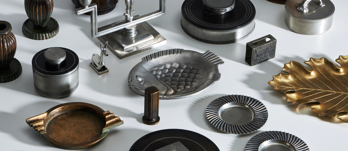 When confronted with the items in the theme "Modern Metal," they seem to have embodied the general spirit of their time. Take, for example, the tobacco tin from GAB, strictly classic, like an architectural bronze detail, serious but always at hand for the smoker. Or the cream dispenser from Firma Grann & Laglye, indispensable when serving with a touch of cool grace. Or why not Sune Bäckström's pair of bronze candleholders in a kind of seed-house shape, cast in Malmö in the 1930s?
