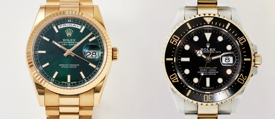 A Rolex Day-Date in 18K is one of the highlights. It features a president bracelet and an English racing green dial. From the most eccentric environments of the 70s comes luxury and extravagance packaged in a Corum Rolls Royce, made of, needless to say, 18K gold. But it's not even half as sporty and freshly groomed as the Omega Seamaster with a blue rotating bezel around the sapphire crystal. Three examples that demonstrate the breadth of the theme. In addition to these, wristwatches from brands such as Breitling, Certina, Longines, Tiffany & Co, Jaeger Le-Coultre, and several other top-notch Rolexes are also offered.