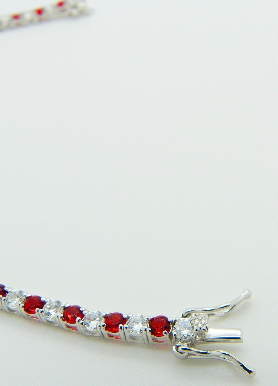 This bracelet is set with 27 x red cubic zirconia stones and 28 x white cubic zirconia stones.