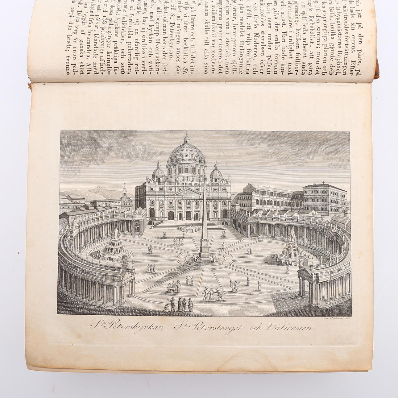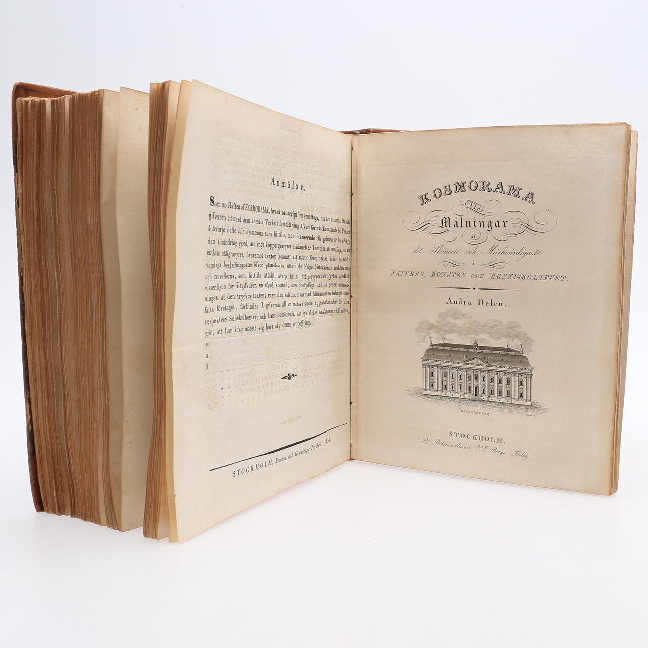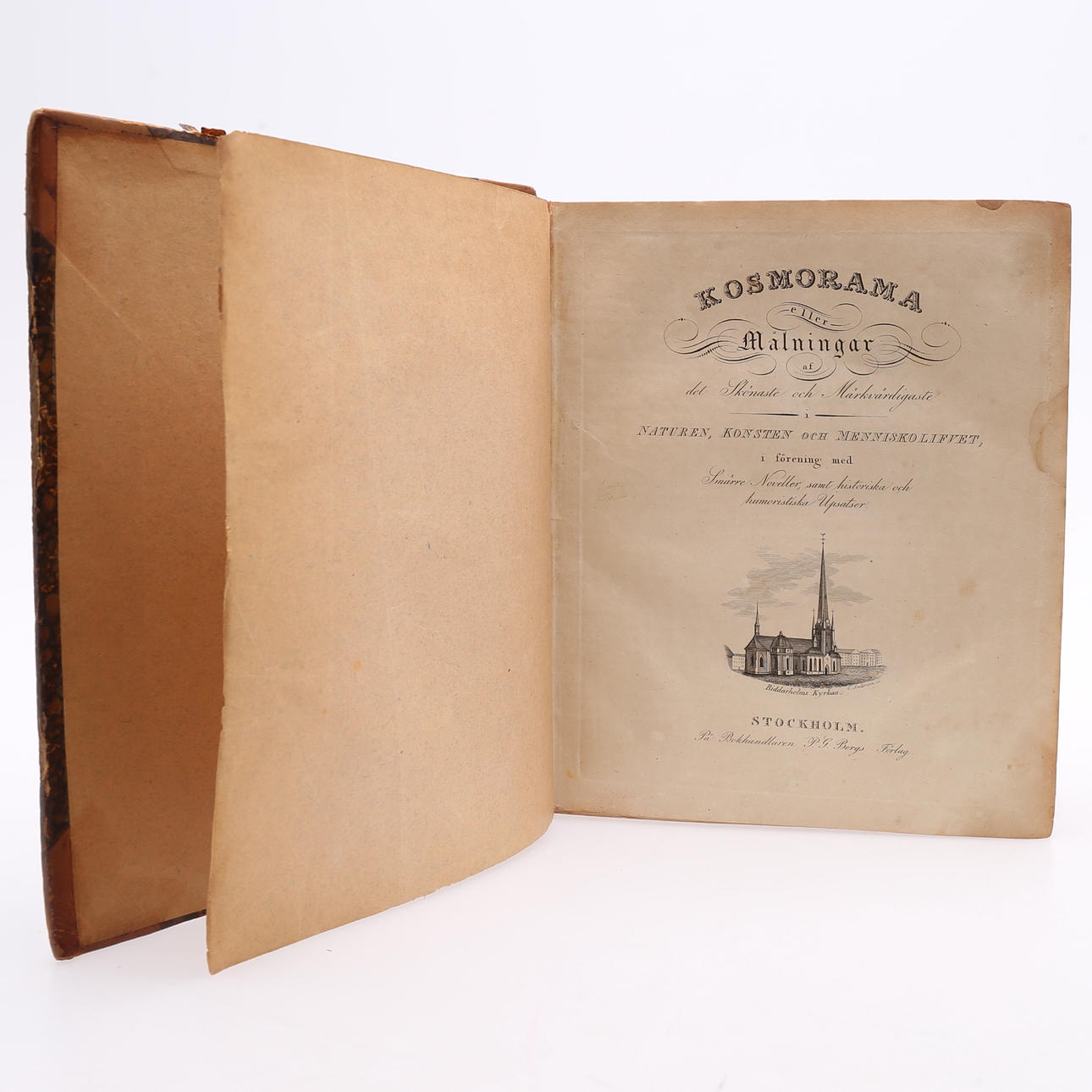Berg, PG , publisher. Cosmoramas or paintings of the most beautiful and remarkable in nature, art and human life, together with short stories, as well as historical and humorous works. I-II. 2 parts in 1 vol. . PG Berg's publisher, Stockholm, 1834-36. 4:oi a contemporary half-French binding with black title label with gilt text on spine. Marbled covers. With engraved title page, and 80 engraved plates and tomb. title page and 39 engraved plates in the second part.. Swedish adaptation of PG Berg after "Kosmorama, oder Gemälde des schönsten und merkwürdigsten aus Natur, Kunst und Menschenleben verbunden mit Novellen, ... Gewande", which was published in Quedlinburg in 1833.