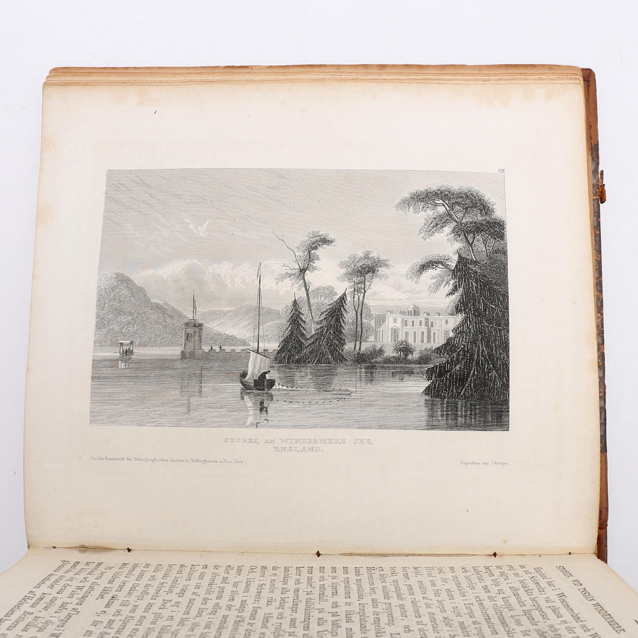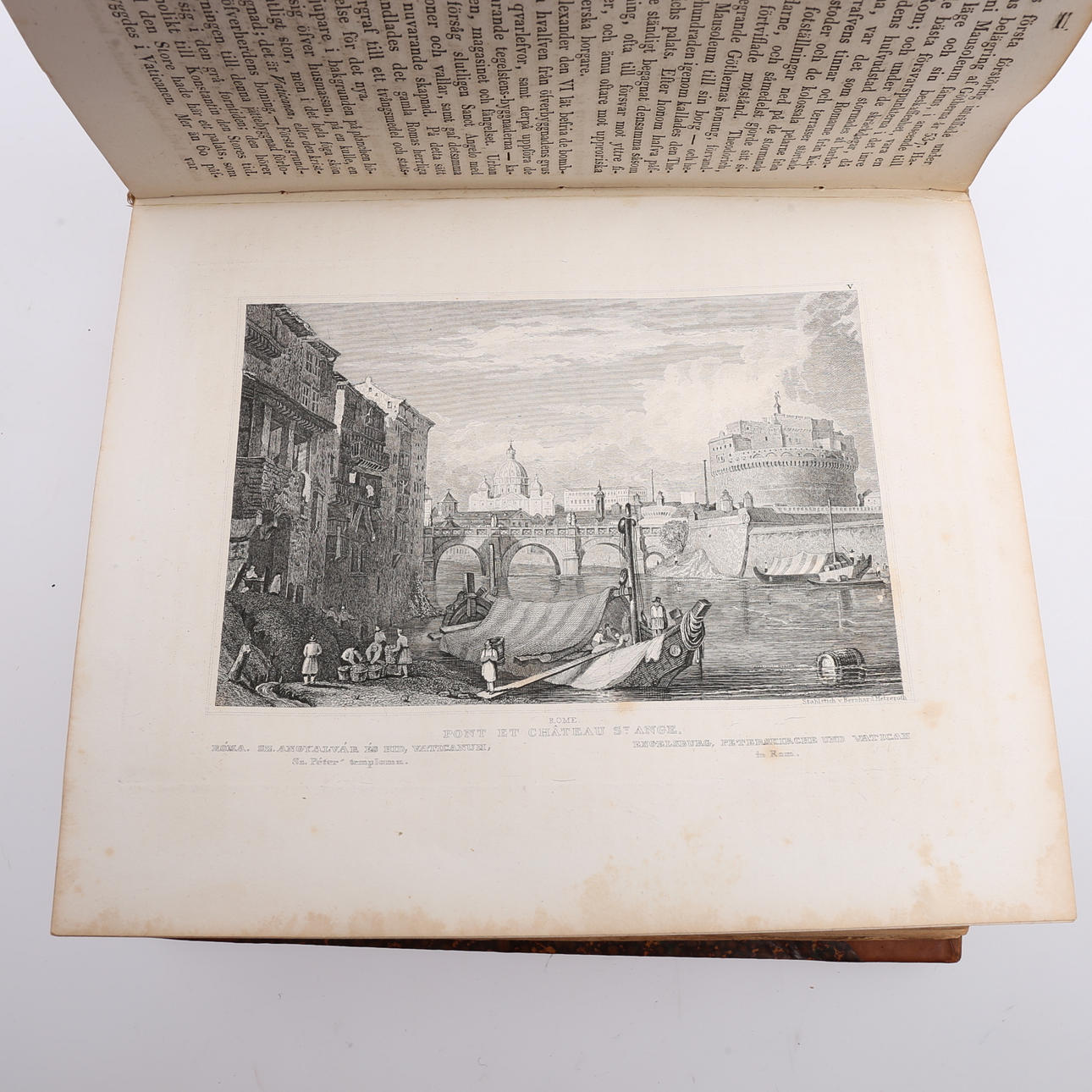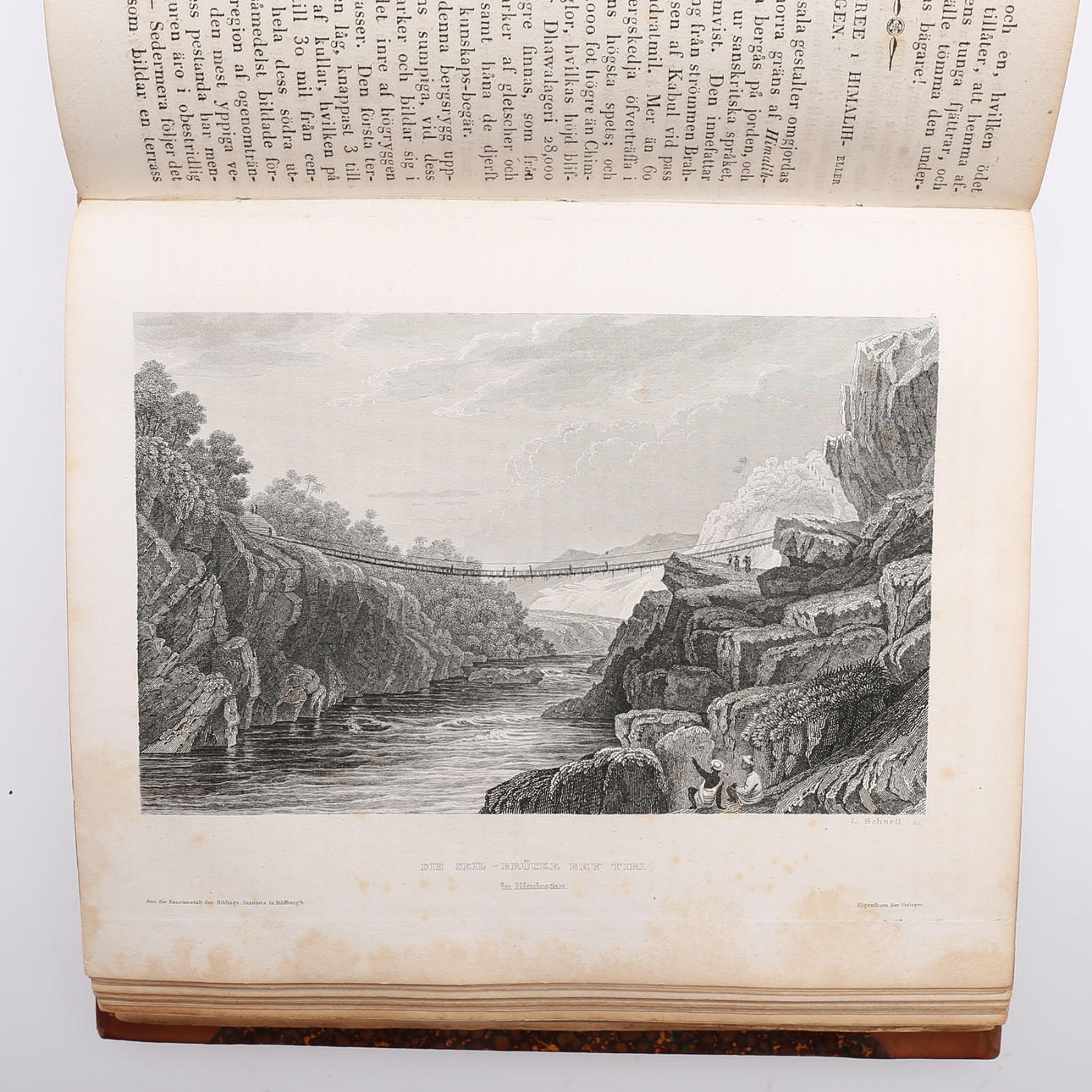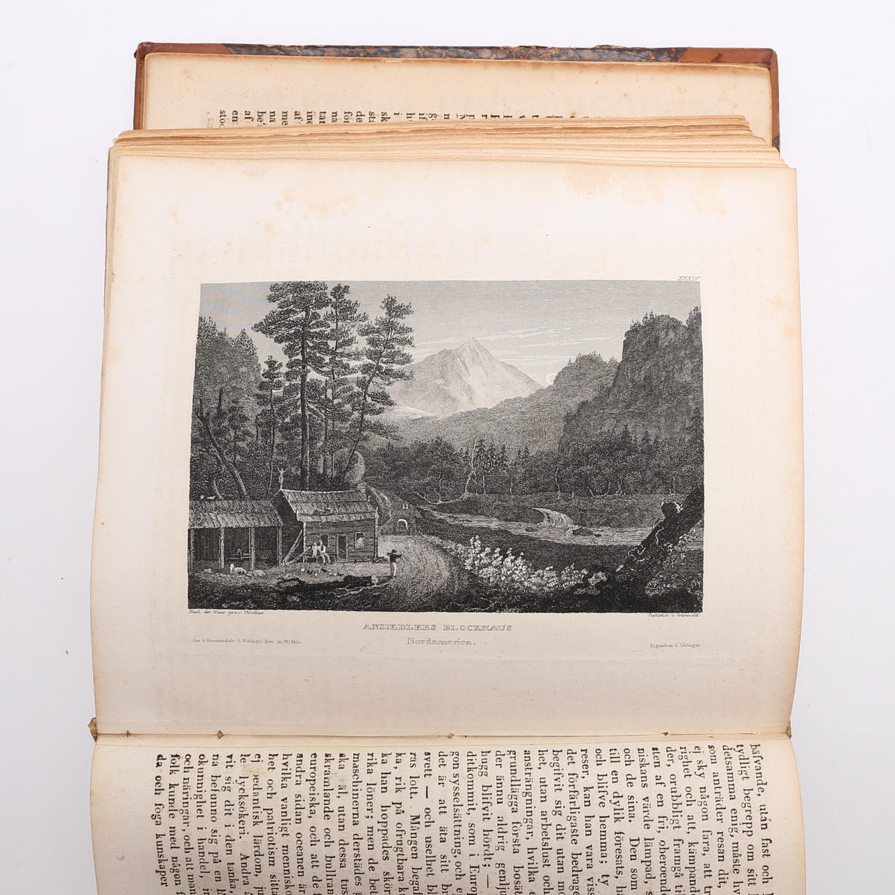 Berg, PG , publisher. Cosmoramas or paintings of the most beautiful and remarkable in nature, art and human life, together with short stories, as well as historical and humorous works. I-II. 2 parts in 1 vol. . PG Berg's publisher, Stockholm, 1834-36. 4:oi a contemporary half-French binding with black title label with gilt text on spine. Marbled covers. With engraved title page, and 80 engraved plates and tomb. title page and 39 engraved plates in the second part.. Swedish adaptation of PG Berg after "Kosmorama, oder Gemälde des schönsten und merkwürdigsten aus Natur, Kunst und Menschenleben verbunden mit Novellen, ... Gewande", which was published in Quedlinburg in 1833.